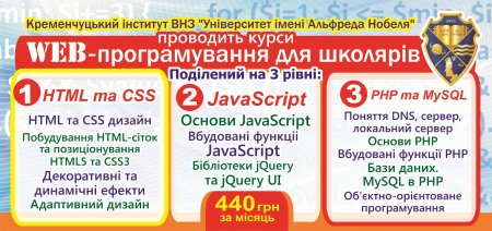 Шановні друзі! Дозвольте запросити Вас навчитися або вдосконалити власний рівень знань в галузі WEB-програмування на курси, які будуть проводитись на базі Кременчуцького інституту ВНЗ «Університет імені Альфреда Нобеля».
