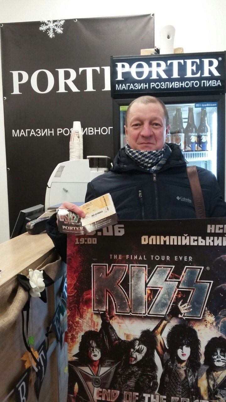 Мазан Владимир - выиграл 2 билета на концерт группы «KISS» - «End of the Road» (совершил покупку в магазине "PORTER", пр-т Леси Украинки, д.57)