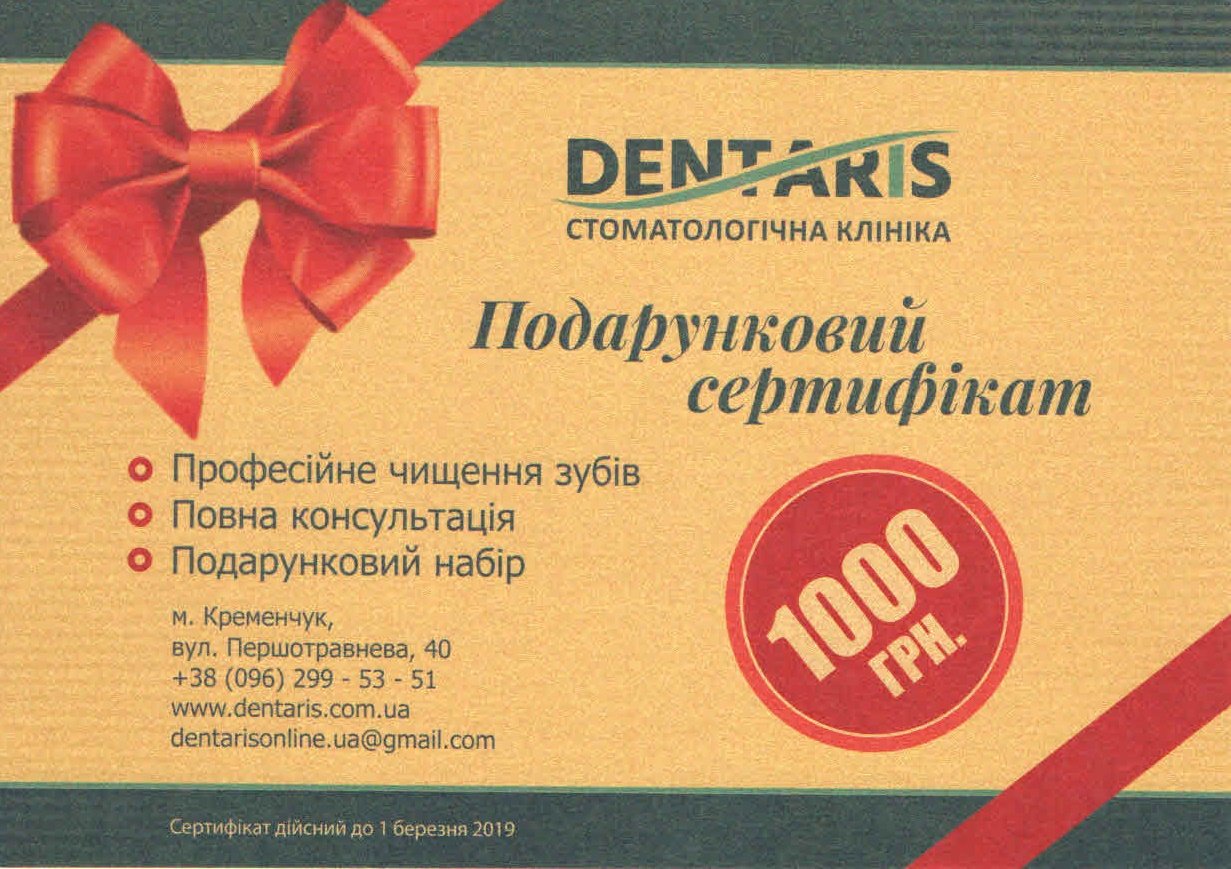 - Подарочные сертификаты от стоматологической клиники DENTARIS на сумму 1000 гривен