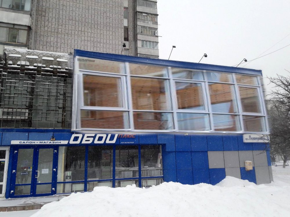Окна помещения выходят на Парк Юбилейный, хотя сегодня они закрыты снаружи бордом, а внутри помещения закрыты гипсокартоном. При прошлом использовании магазина (тут долгое время находился магазин детских вещей «Chicco»), скорее всего, это было необходимо для правильного освещения товара. Хотя сегодняшние фасадные системы могут превратить это помещение в очень светлый и красивый объект.