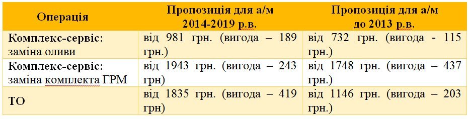 У таблиці нижче продемонстровано основні принципи формування вигоди для клієнтів (в залежності від віку автомобіля та необхідних робіт):