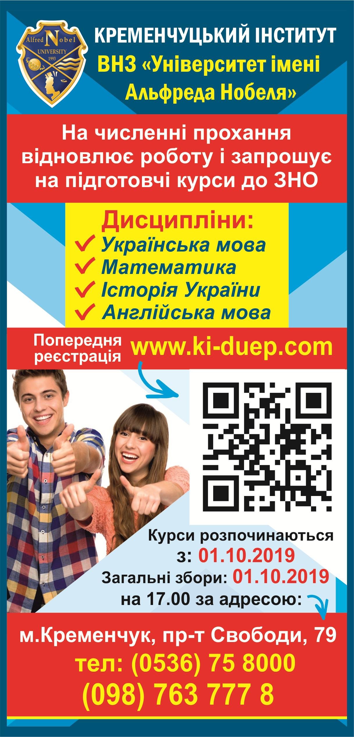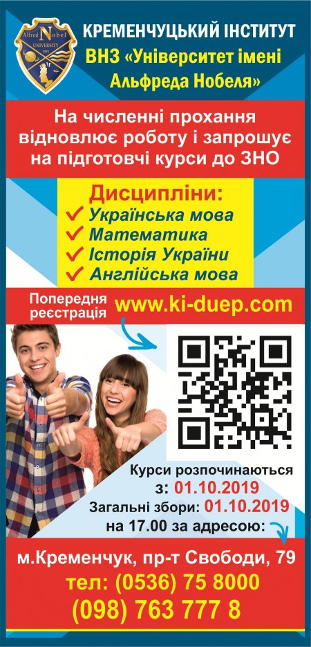 Якщо ви бажаєте стати частиною великої та дружньої родини Кременчуцького інституту ВНЗ «Університет імені Альфреда Нобеля» та отримати якісну освіту, запрошуємо до нас!