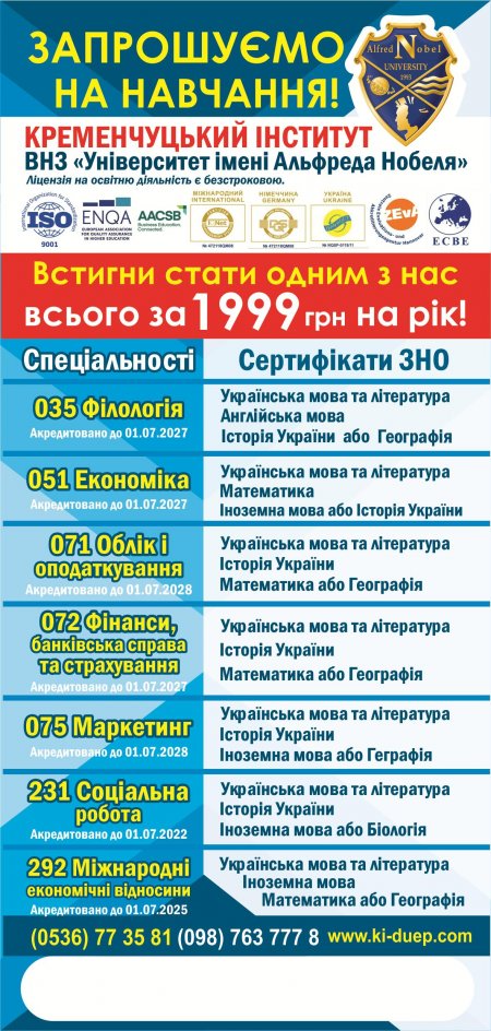Оголошується 2й етап набору за ЗАОЧНОЮ формою навчання до Кременчуцького інституту ВНЗ «Університет імені Альфреда Нобеля»!