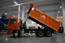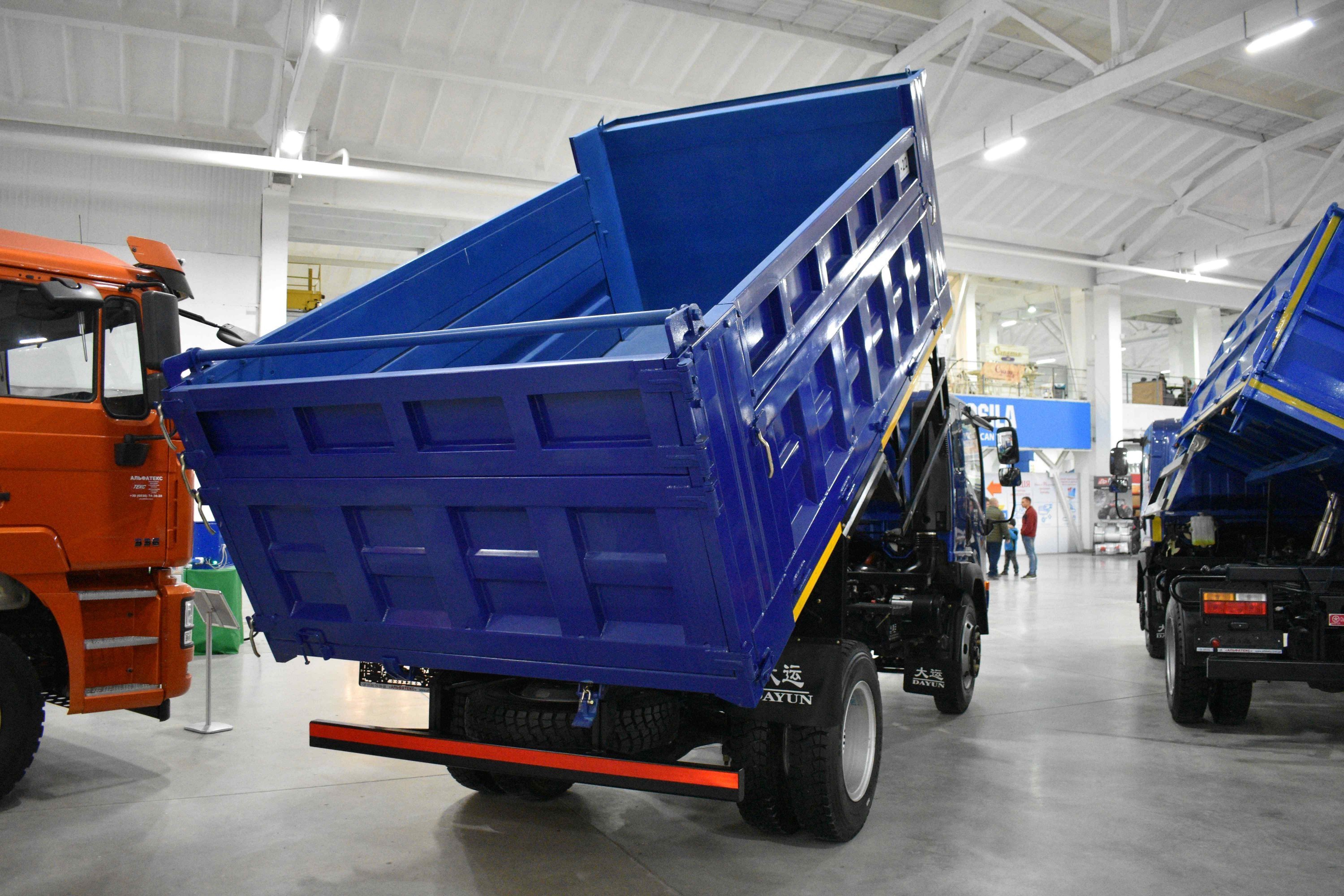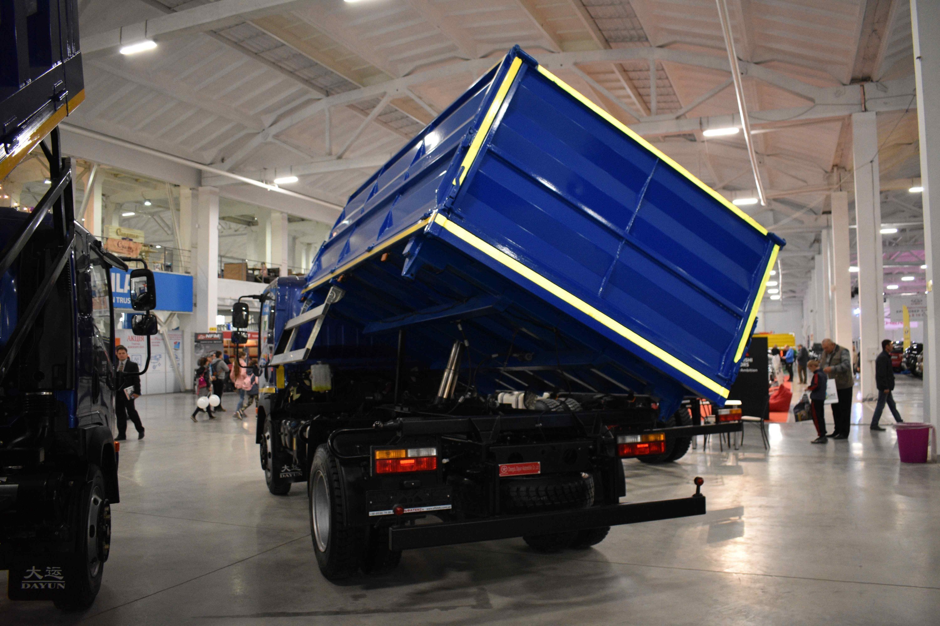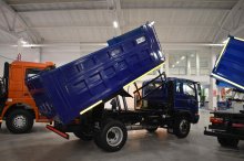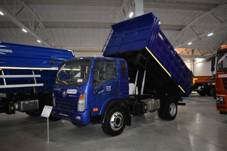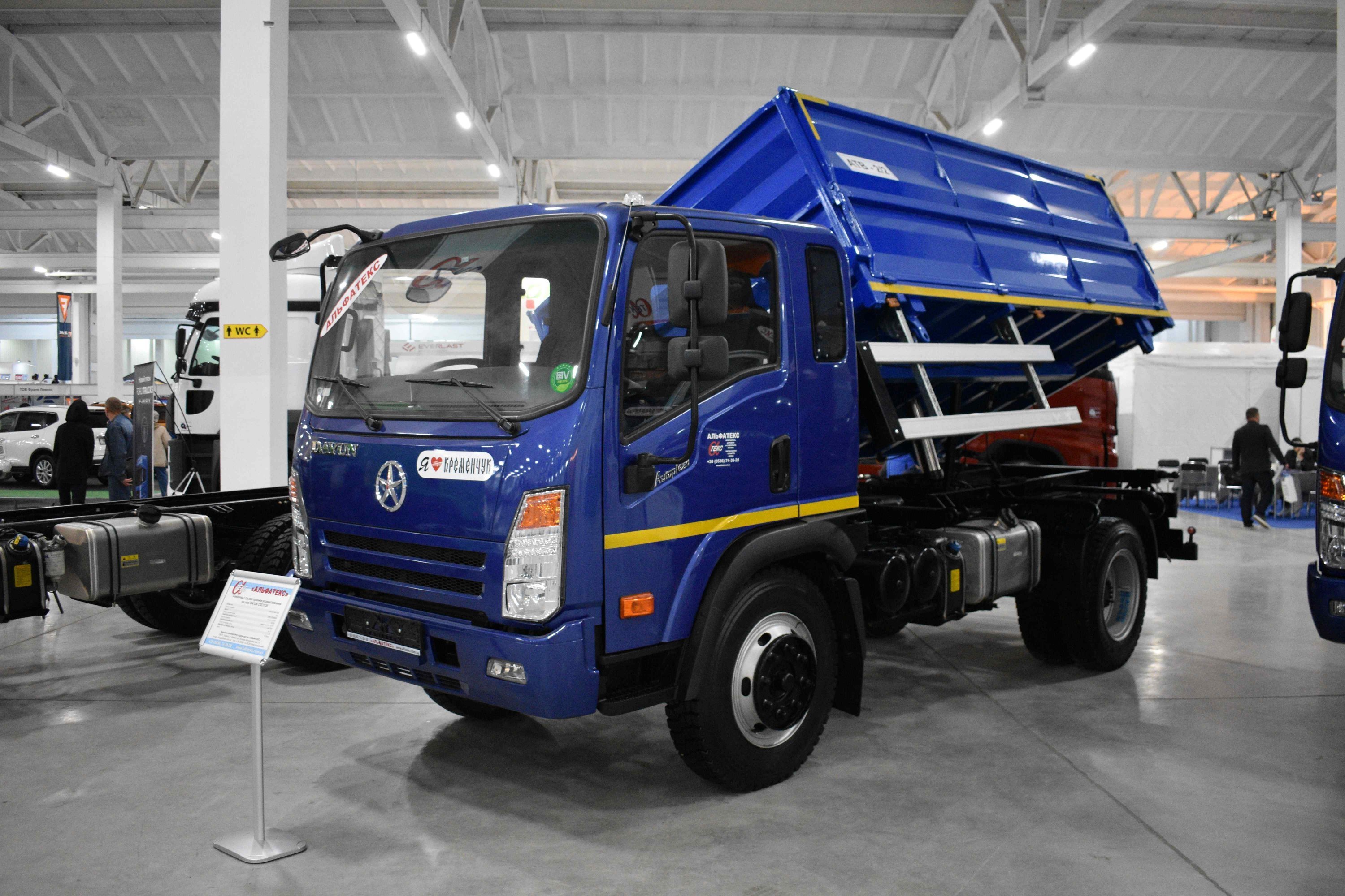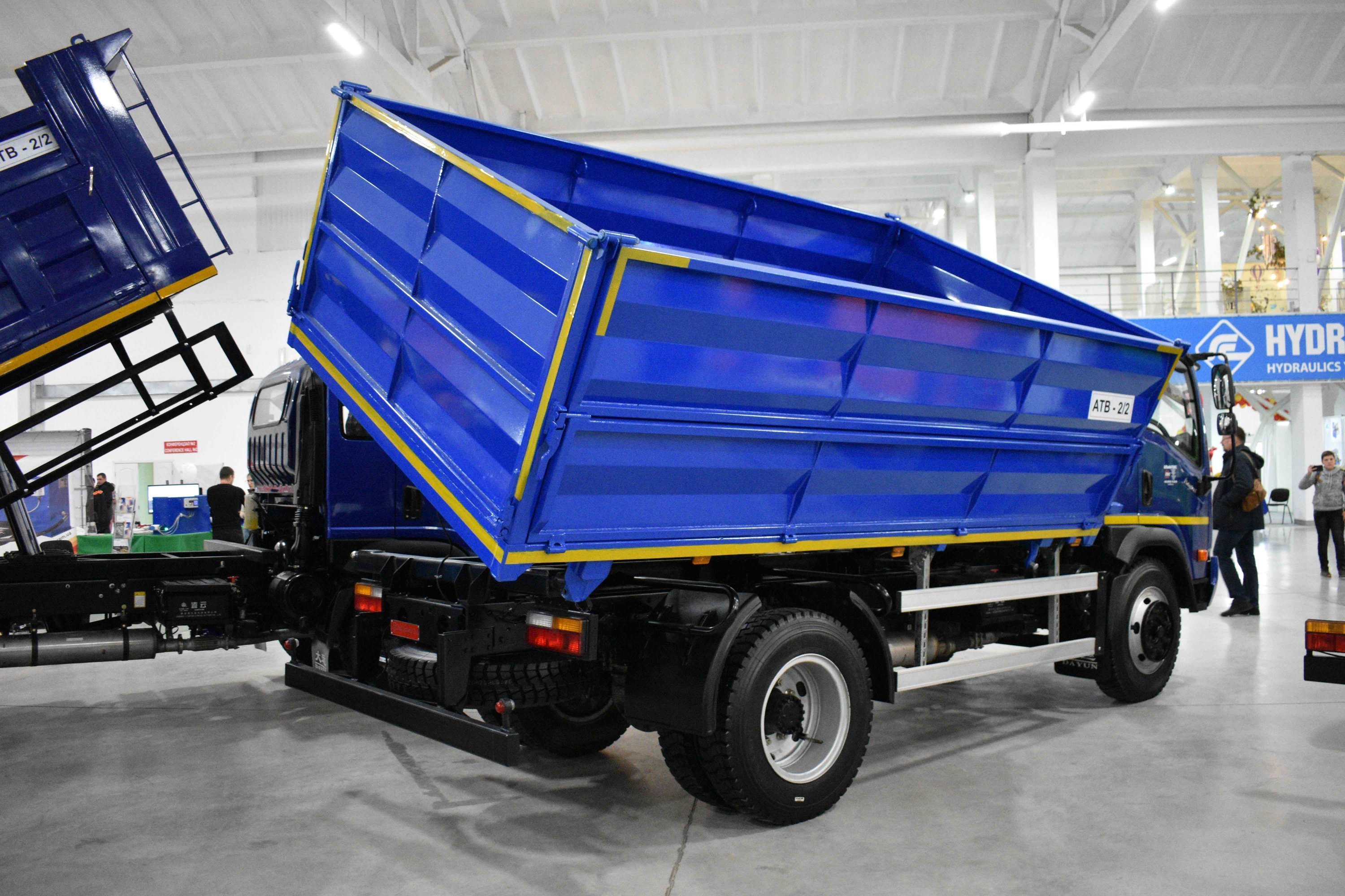 На выставке представлены две машины на этом шасси – самосвалы с задней и трехсторонней разгрузкой, грузоподъемностью до 7 т и объемом кузова – до 12 куб м.