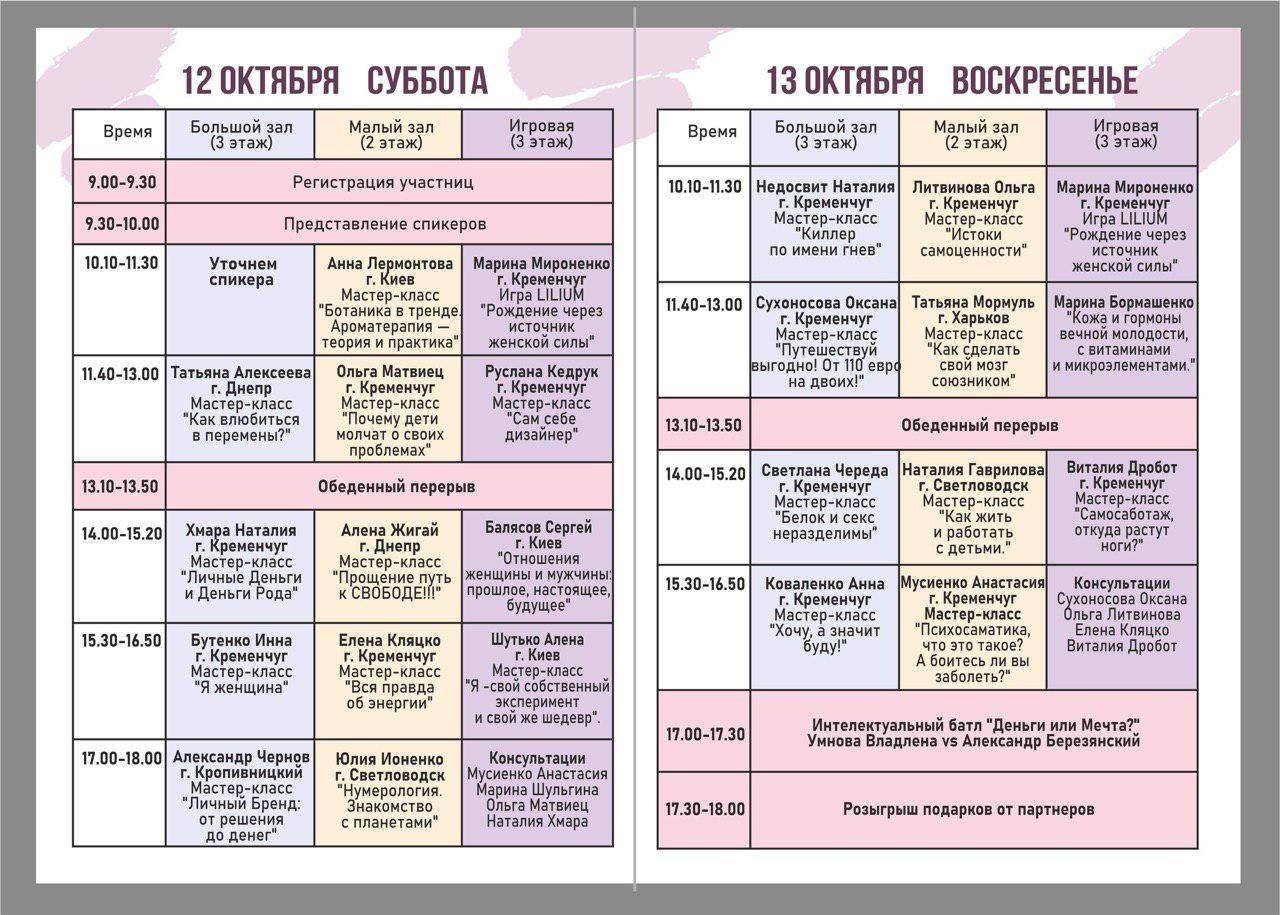 Спікери з Кременчука та інших міст розкажуть про гроші, спілкування з дітьми, енергію, відносини, харчування, мозок, психосоматику і багато іншого. Як навчитися читати етикетку на косметиці та зробити так, щоб шкіра виглядала молодою? Що робити з дитиною, яка постійно тримає в руках телефон? Як пробачити людину і подолати гнів? Де знайти «чарівний пендель», щоб почати досягати поставлених цілей? На одному з майстер-класів можна розмалювати власний одяг та віднести додому свою авторську дизайнерську річ або ж за допомогою трнсформаційної гри розібратись у собі.