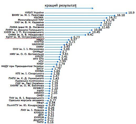 За матеріалами аналітичного звіту Національного агентства забезпечення якості вищої освіти: «Високі загальні показники продемонстрували Київський національний університет імені Тараса Шевченка, Національний університет біоресурсів і природокористування України, Харківський національний університет імені В. Н. Каразіна, шість ЗВО мистецького спрямування (Львівська національна академія мистецтв; Львівська національна музична академія імені М. В. Лисенка; Національна академія образотворчого мистецтва; Національна музична академія України імені П. І. Чайковського; Одеська національна музична академія імені А. В. Нежданової; Харківський національний університет мистецтв імені І. П. Котляревського), по одному аграрному (Миколаївський національний аграрний університет) і медичному (Львівський національний медичний університет імені Данила Галицького) університету, а також один заклад, розташований у районному центрі (Кременчуцький національний університет імені Михайла Остроградського)».