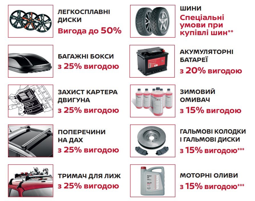 Під вигодою мається на увазі співвідношення ціни на період Акції порівняно зі звичайною рекомендованою ціною. На різні найменування запчастин встановлено різний розмір вигоди. Розмір вигоди є рекомендованим, остаточна ціна встановлюється дилерським центром. Детальний перелік запчастин, на які розповсюджується вигода, та умови отримання вигоди можна дізнатися у консультантів сервісного центру NISSAN.