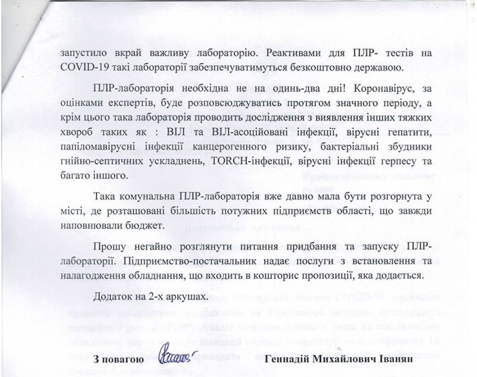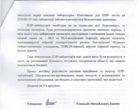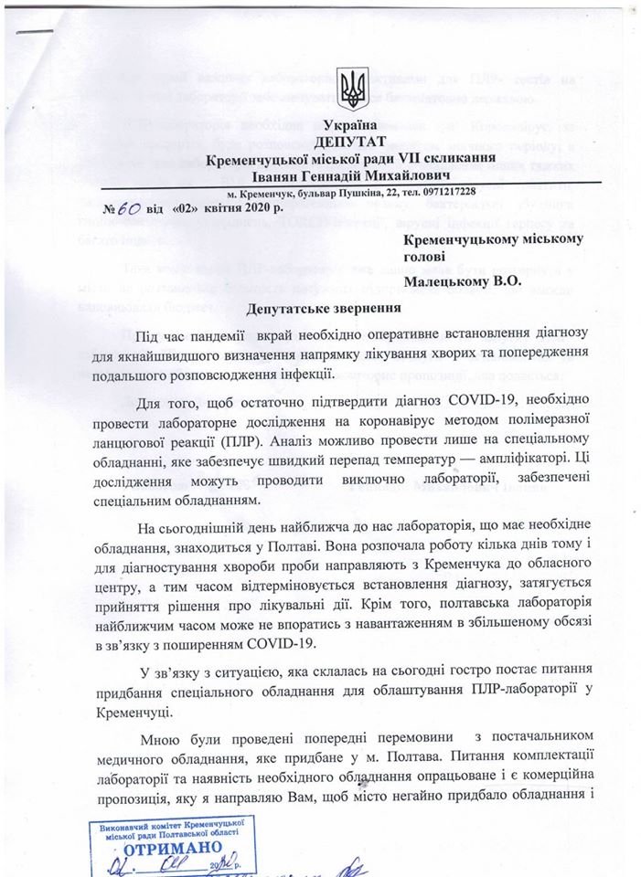 Питання комплектації лабораторії та наявність необхідного обладнання було опрацьоване з фахівцями Києва та Полтави і підготовлена комерційна пропозиція, що була направлена міському голові Віталію Малецькому (дата подання зазначена на позначці про прийняття мого депутатського звернення,яке додаю до цієї публікації).