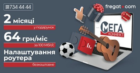 Вже тисячі українців оцінили швидкісний інтернет та економічну вигоду від акції “Мега Коннект”! Перші 2 місяці користування без абонплати, налаштування роутеру та 10 м кабелю безкоштовно, далі абонплата всього 64 грн/міс за 100 мбіт/сек!