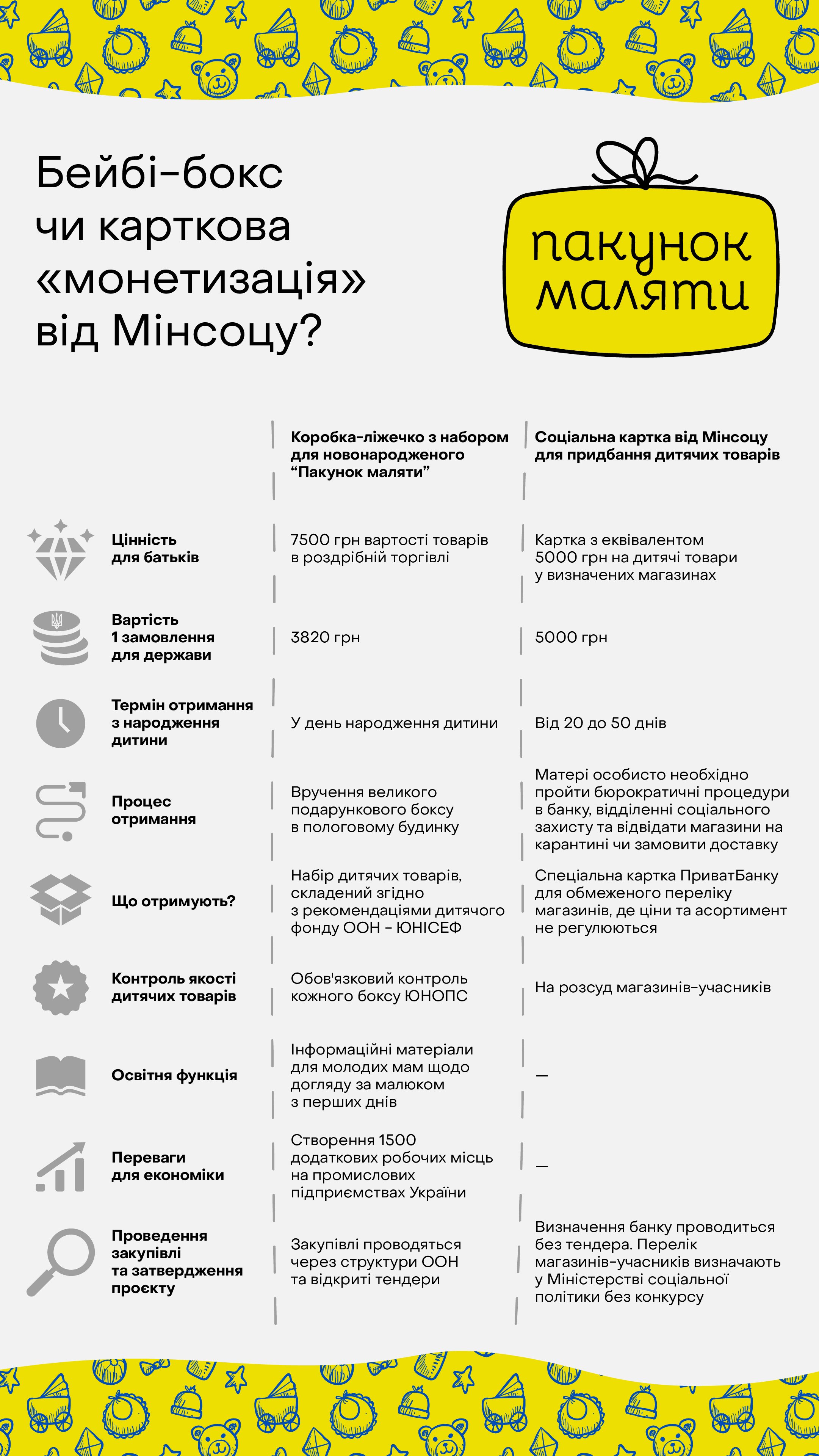 Як виявилось, він дещо відрізняється від того, на що розраховували українські матері. Грошей на руки ніхто не отримає. Фактично, мами отримують право зібрати у визначених магазинах той самий Бейбі бокс, але самотужки і за меншу кількість грошей (З кінця 2019 року «Пакунок малюка» складався з речей на суму 7200 грн в точках роздрібної торгівлі).