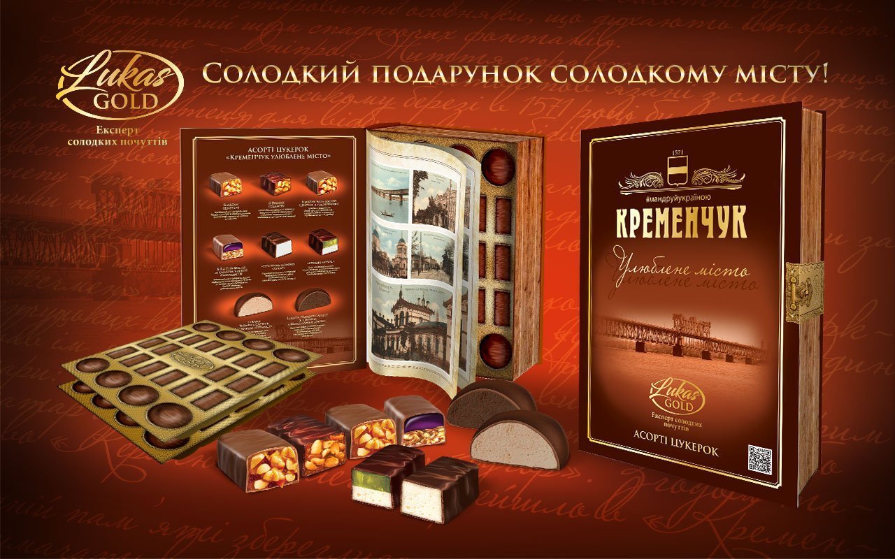 Сторінки справжньої історії обіймають могутню велич Дніпра, а неймовірні солодощі шепочуть рідну назву – Кременчук. Найкращі цукерки Bifesti, Sharzan, O`Damer, Womens caprise, «Пташине молоко» та «Аркадія» – все це LUKAS GOLD, все це – «Кременчук. Улюблене місто».