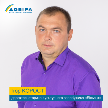Директор історико-культурного заповідника «Більськ» Ігор Корост долучився до команди політичної партії «Довіра», щоб розвивати туристичний напрямок на Полтавщині, підтримувати культурну галузь, працювати над розвитком сільських територій.