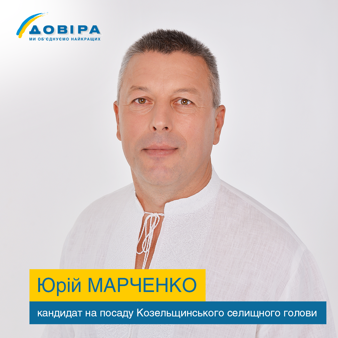 Постать цього ініціативного лідера є потужним посиленням рядів політичної партії «Довіра». Багаторічний успішний досвід Юрія Марченка на посаді голови Козельщинської районної ради перевірений часом і успішно реалізованими проектами.