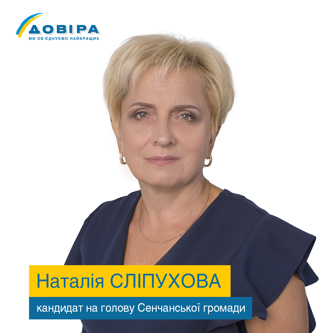 Ще однією представницею команди «ДОВІРИ» стала Наталія Сліпухова, яка балотується на посаду голови Сенчанської об’єднаної громади. Наталія Вікторівна нині є головою Вирішальненської сільської ради.