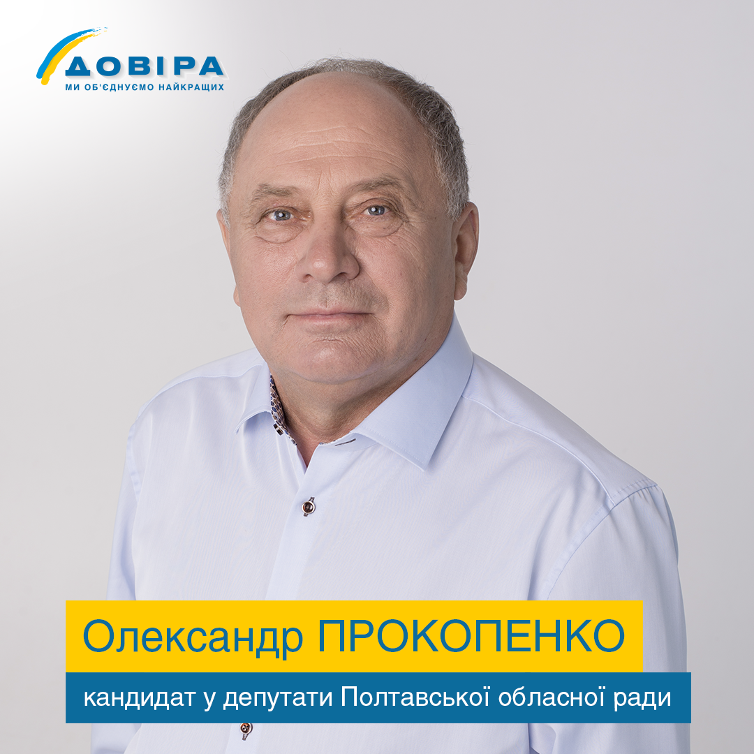 Покликання Олександра Івановича Прокопенка – добробут людей. Саме тому він обрав «ДОВІРУ». Бо побачив серед команди своїх однодумців тих, хто живе і працює заради інших. Олександр Іванович впевнений: завдяки своїй повсякденній праці він здатен достойно представляти громаду у команді «ДОВІРИ», яка об’єднує лише найкращих.