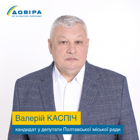 Полтавщина заслуговує на краще, переконаний кандидат у Полтавську міську раду Валерій Каспіч, який приєднався до команди «ДОВІРИ». Валерій Каспіч – директор ТОВ «Регіонбудсервіс», волонтер та благодійник, який любить Полтаву та щасливий на своїй землі. Довгий час присвятив військовій службі. Започаткував власні підприємства професійно-технічної освіти та будівництва.