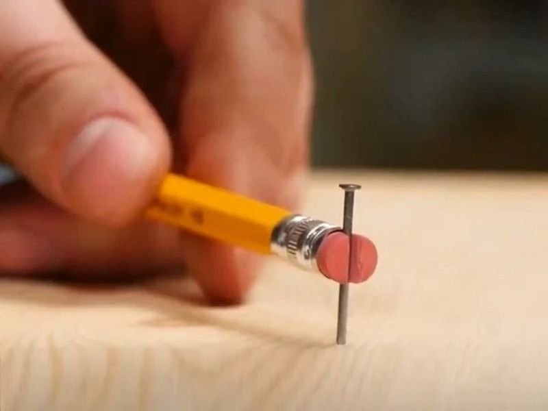 Цвяхи. Забиваючи дрібні цвяхи, використовуйте олівець з розрізаним ластиком, затиснувши цвях у цей отвір для безпеки. Тоді потрапляння пальців під молоток буде неможливим. Використовуйте струбцину, щоб забити цвях в місці, де немає доступу для молотка.