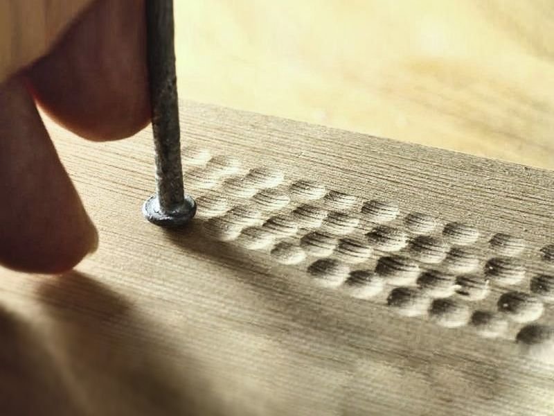 1. Створення текстури. З цією метою використовують звичайні цвяхи. Достатньо взяти в руки молоток і цвях і, ввімкнувши свою уяву, приступити до роботи з матеріалом.