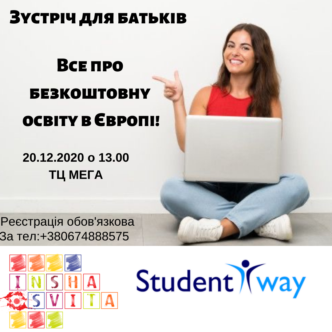 Запрошуємо Вас та ваших дітей на зустріч «Все про безкоштовну освіту у Європі» з засновниками Освітньої Агенції “Studentway”, яка відбудеться 20 грудня о 13.00 в ТЦ МЕГА, 4 поверх Інша Освіта.