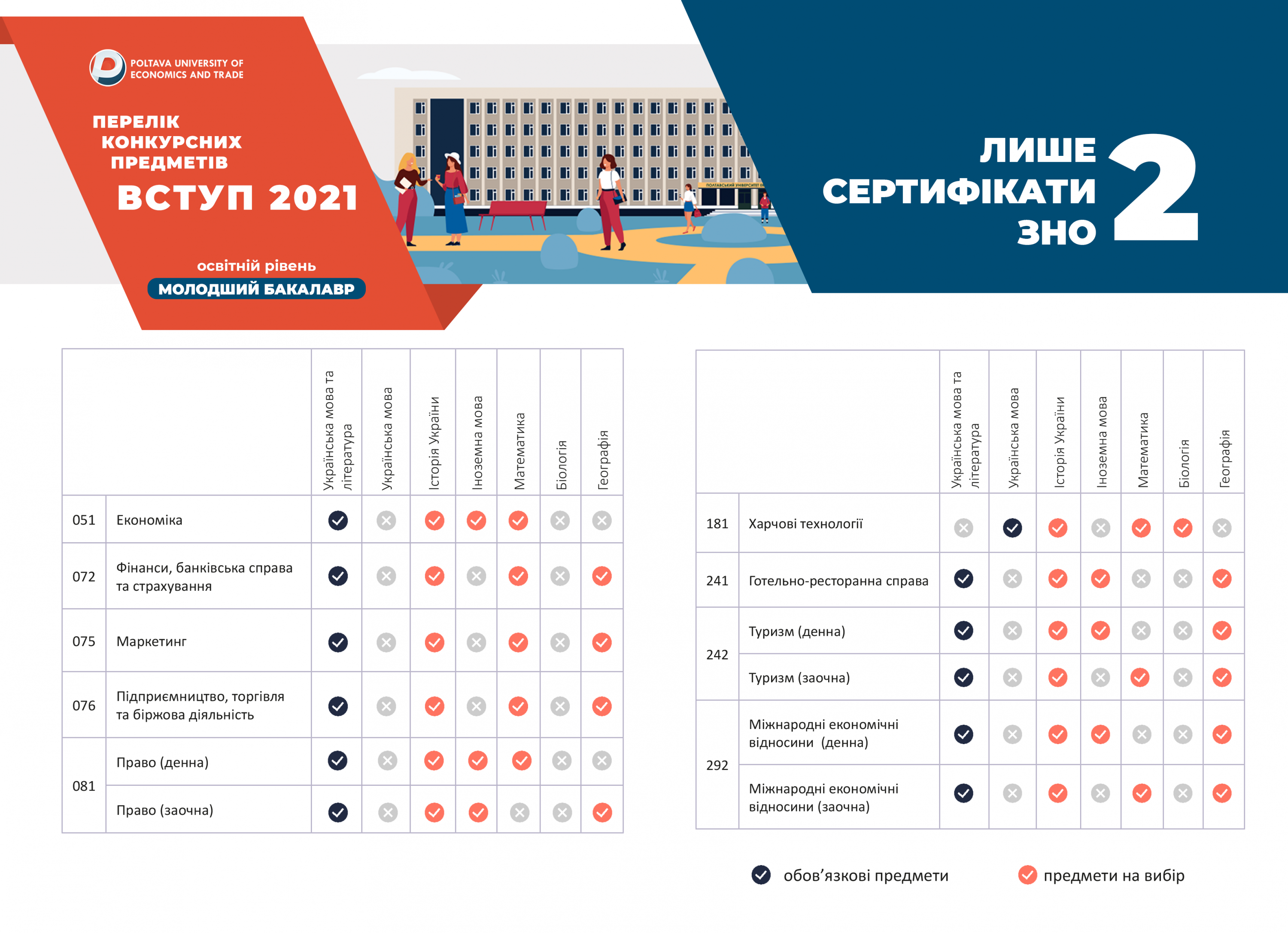 – Щодня до нас надходять дзвінки та електронні листи-звернення щодо можливостей вступу для отримання вищої освіти вже цього року за наявності лише двох ЗНО. Можемо запевнити, що Полтавський університет економіки і торгівлі має чудову пропозицію для таких абітурієнтів. ПУЕТ вже не перший рік приймає на навчання за ступенем молодшого бакалавра за 9 спеціальностями, а саме: Економіка, Фінанси, банківська справа та страхування, Маркетинг, Підприємництво, торгівля та біржова діяльність, Право, Харчові технології, Готельно-ресторанна справа, Туризм, Міжнародні економічні відносини. Молодший бакалавр – це ступінь вищої освіти з терміном навчання 2 роки. З його дипломом у випускника є можливість або розпочати професійну діяльність за обраним фахом або продовжити навчання на бакалавраті й отримати диплом бакалавра (за 2 роки), причому, за будь-якою спеціальністю Університету з більш широкого переліку. Отже, маючи лише два предмети ЗНО за чотири роки навчання, ви отримуєте не лише повну вищу освіту на бакалаврському рівні, але й, за бажанням, два дипломи з різних спеціальностей.