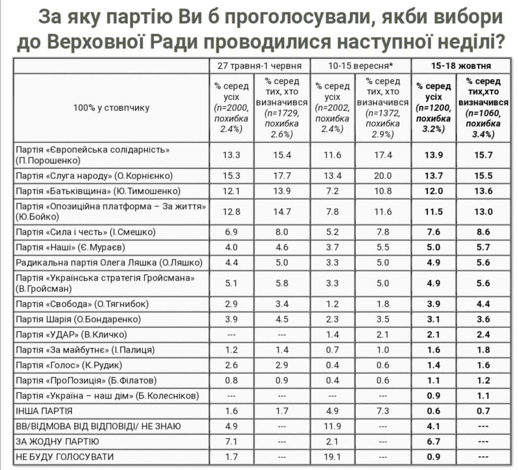 Згідно з ними політична партія «Українська Стратегія Гройсмана» нарощує рейтинг і впевнено долає прохідний бар’єр до Верховної Ради України. Як свідчать результати соціологічного дослідження від Київського міжнародного інституту соціології, у вересні рейтинг партії становив 5%, а в жовтні цей показник зріс до 5,6%.