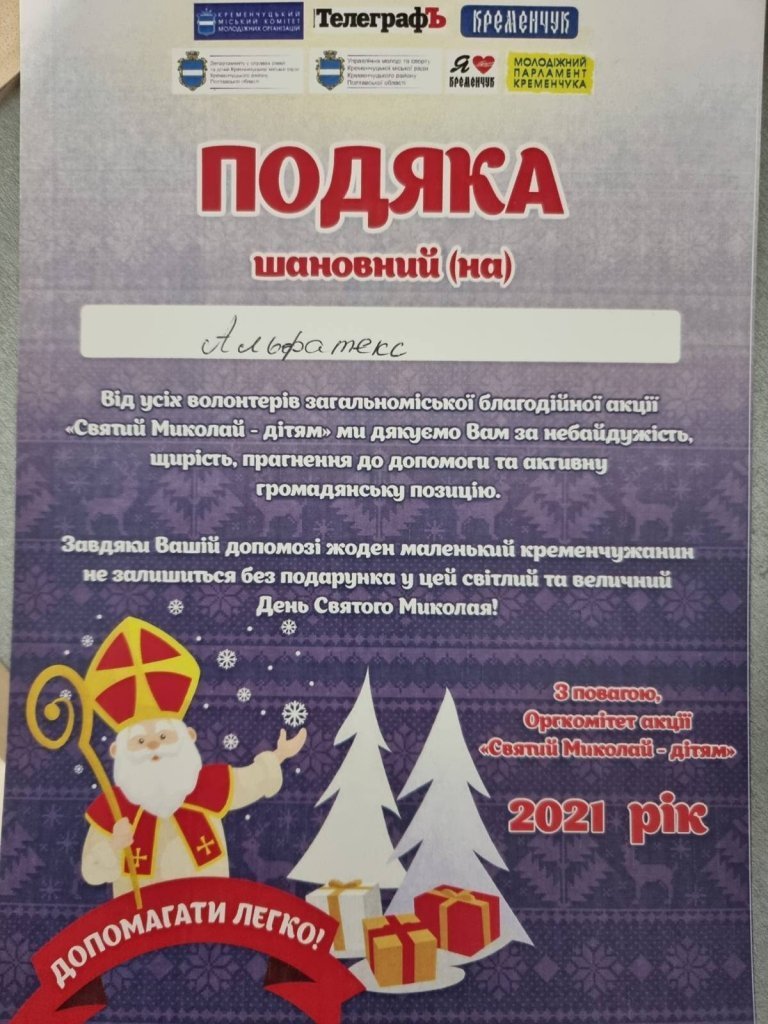 3. Взяв участь у щорічній благочинній акції «Святий Миколай — дітям» та передав солодкі подарунки на адресу: Асоціації Інвалідів дитинства «Новий дім»; проведення благодійного свята «Різдвяне чудо 3.0» для дітей з ментальними особливостями (синдром Дауна, ДЦП та ін.), дитячого психоневрологічного відділення КП «ПОДС» та Молодіжного Парламенту Кременчука.
