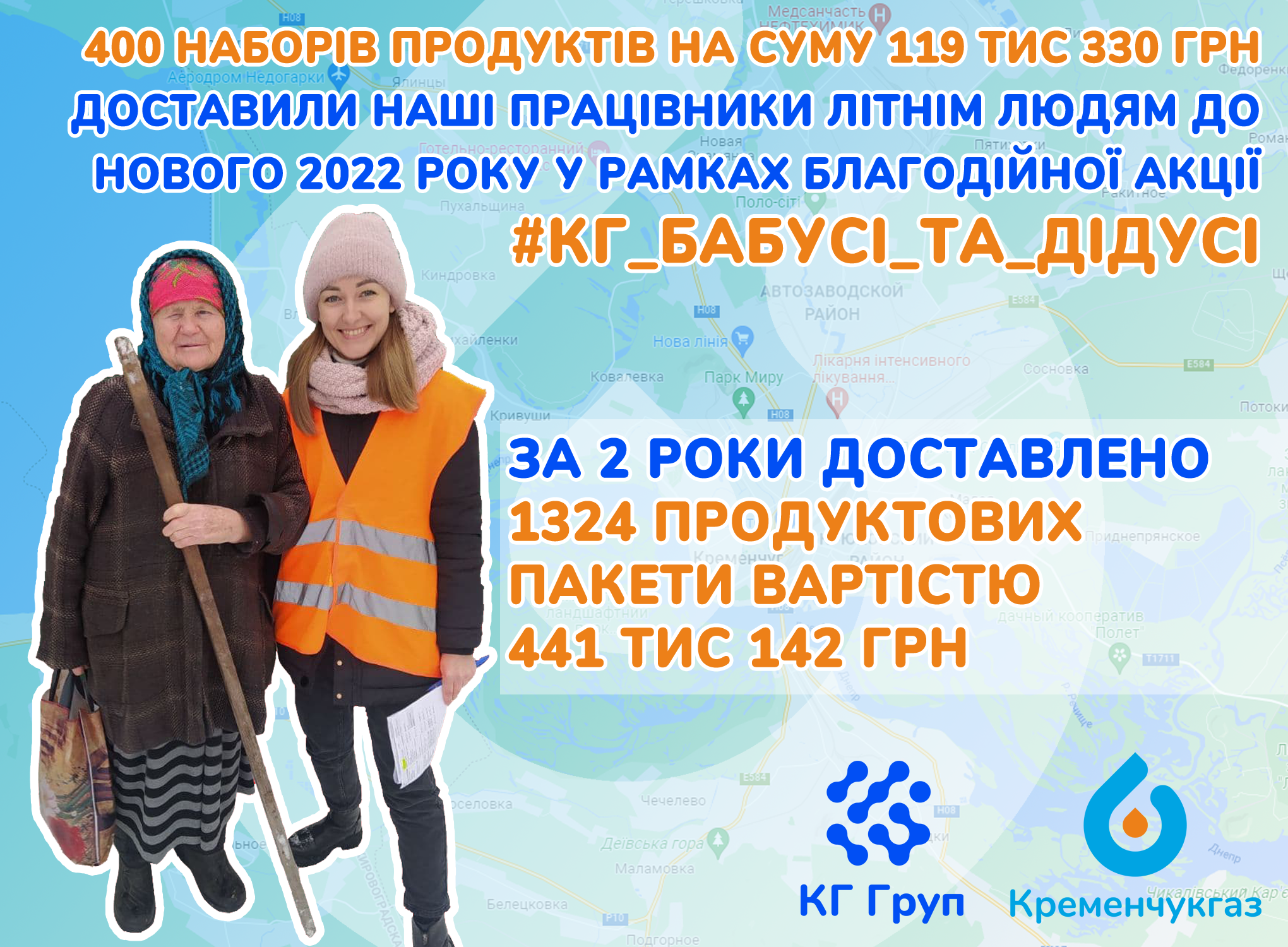 На часі говорити про добро, що рятує світ: самотнім людям напередодні новорічних свят принесли гостинці – працівники ПрАТ «Кременчукгаз» разом із групою компаній «KG_GROUP» в рамках корпоративної соціальної відповідальності провели благодійну акцію «КГ_Бабусі_та_Дідусі» Новий рік 2022.