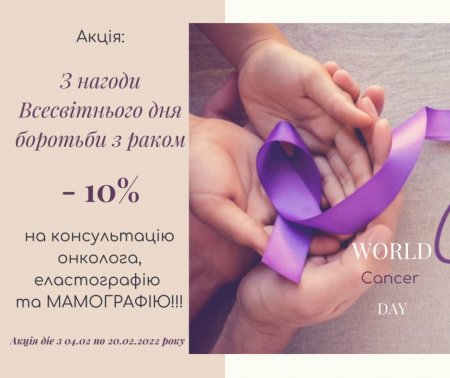 З 04.02 до 20.02.2022 року діє 10 % знижка на консультацію онколога, еластографію молочних та щитоподібної залоз, мамографію!