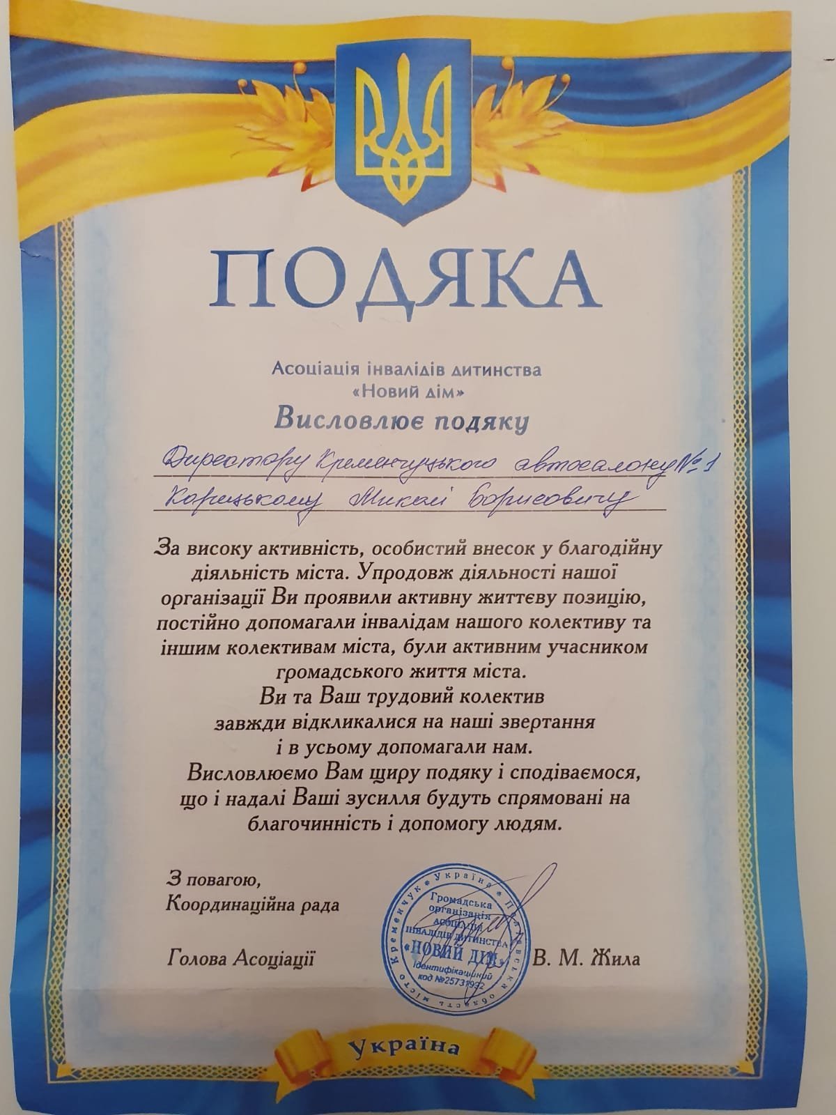 Микола Корецький — Депутат Полтавської обласної ради, директор Кременчуцького заводу комунальної техніки АЛЬФАТЕКС, десятиліттями допомагає колективу Асоціації інвалідів дитинства «Новий дім» робити спогади діточок про найкращий період життя радісними та приємними, здійснювати їхні дитячі мрії. Цього року Микола Борисович отримав Подяку від Координаційної ради асоціації за високу активність, особистий внесок в благодійну діяльність міста та багаторічну допомогу діткам з обмеженими можливостями.