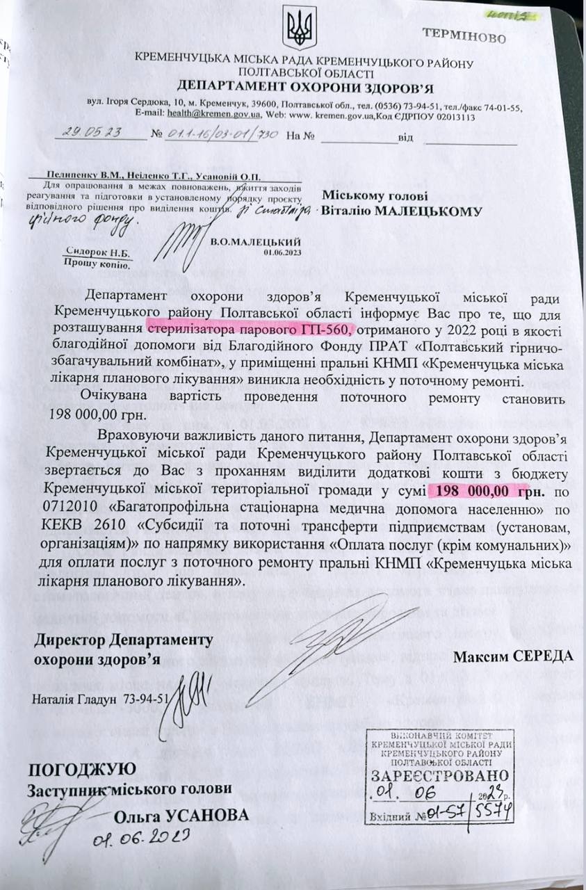 На минулій сесії Кременчуцької міської ради, депутат Богдан Лазоренко порушив питання, щодо облаштування приміщення стерилізаційної, де в занедбаному вигляді, вже рік, стоїть новий паровий форвакуумний стерилізатор. Дороговартісне медичне обладнання було придбане в рамках реалізації програми корпоративної соціальної відповідальності компанії Ferrexpo.