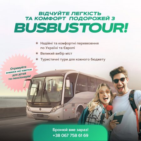 Компанія BusBusTour пропонує надійні та комфортні перевезення по Україні та Європі, великий вибір міст, туристичні тури для кожного бюджету. Для дітей і пенсіонерів діють знижки.