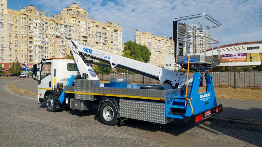 АЛЬФАТЕКС є офіційним дистриб'ютором італійської компанії CTE Group, яка виготовляє різноманітні підйомники на автомобільних шасі та самохідних гусеничних платформах. На виставці було представлено автовишку CTE B-LIFT 200 HY на шасі DAYUN CGC1060 з робочою висотою підйому до 20 метрів.