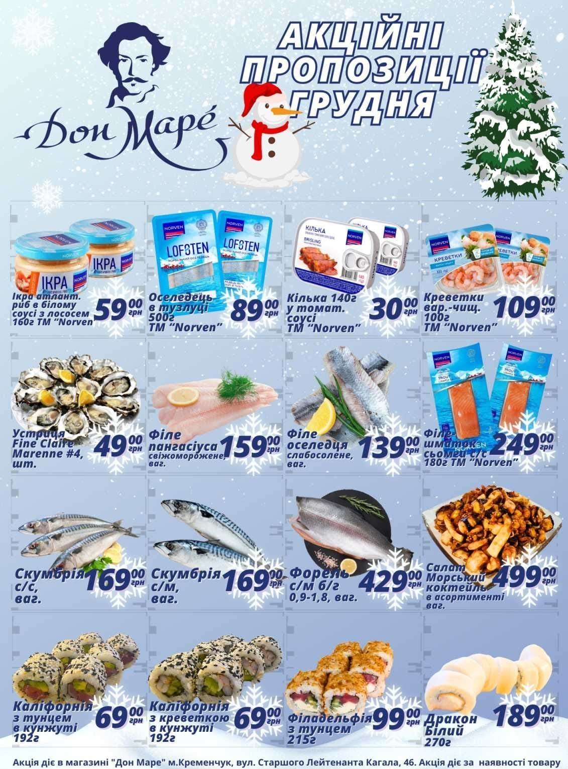 Придбати смаколики до святкового столу можна в рибному маркеті Дон Маре. Будь-якого гурмана потішить широкий асортимент дарів моря та океану: охолоджена риба різних видів, улюблені морепродукти, елітні делікатеси, найсмачніші суші, салати і багато іншого - це все, що потрібно для сімейної вечері або приємної компанії. До речі, всі продукти найсвіжіші та високої якості.
