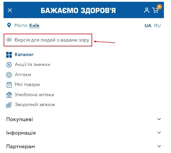 Версія для людей з вадами зору забезпечує доступність інформації для всіх категорій клієнтів.