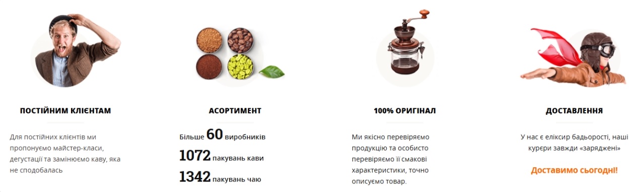 За весь час роботи ми навчилися і згодом покращилися у всіх процесах комунікації. Кожне замовлення дбайливо запаковується у фірмові упаковки для збереження всіх властивостей продукції та товарного вигляду. У замовлення до чайно-кавової продукції додатково додаються невеликі інструкції з простими порадами та рекомендаціями щодо приготування напою. Як презент – фірмовий пакетик. Але кава і чай, це не єдина наша слабкість. Ми пропонуємо насолодитися й іншими продуктами, а також скористатися професійною технікою.