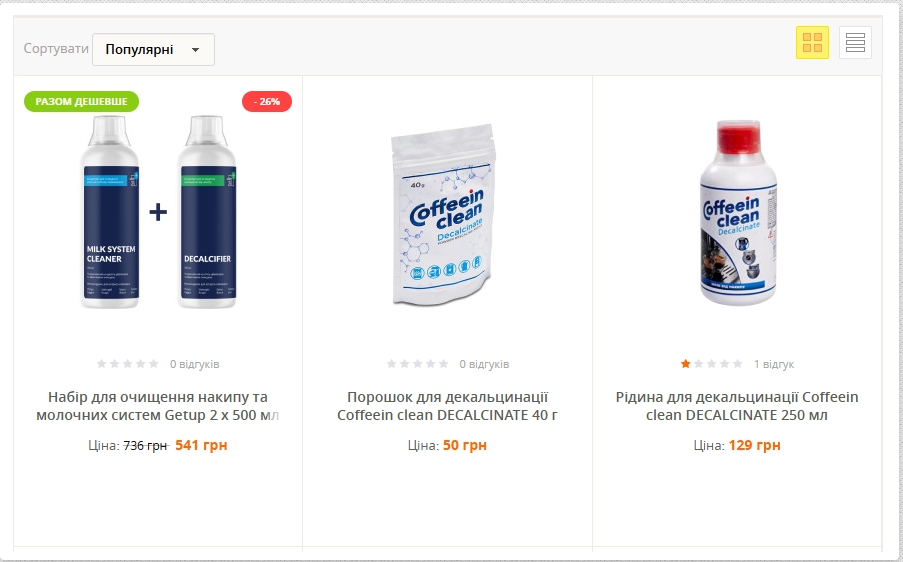 - фільтри для кавомашин, таблетки та мастила.
