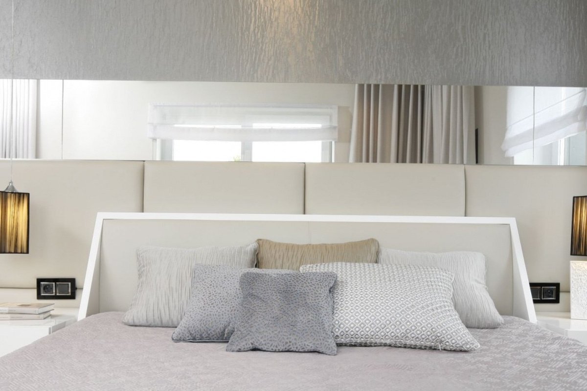 Велике суцільне дзеркало, композиція із багатьох дзеркал, окремі дзеркальні панелі – підійде будь-який варіант. Такий дизайн спальні візуально розширює простір і відкриває шлях до експериментів. Поверхню дзеркала можна цікаво оформити за допомогою художнього матування або штучно зістарити. Для безпеки краще використовувати дзеркала зі скошеними краями.