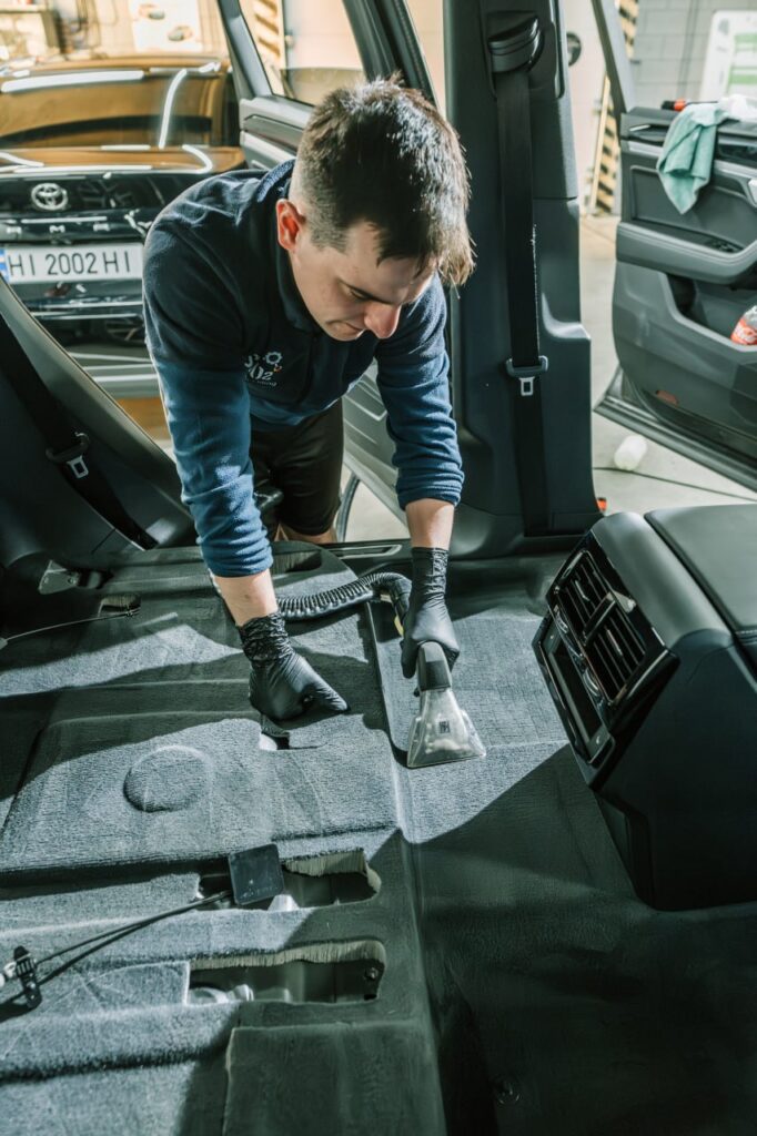 Під час процесу знімаємо сидіння і ретельно чистимо весь килим салону авто.