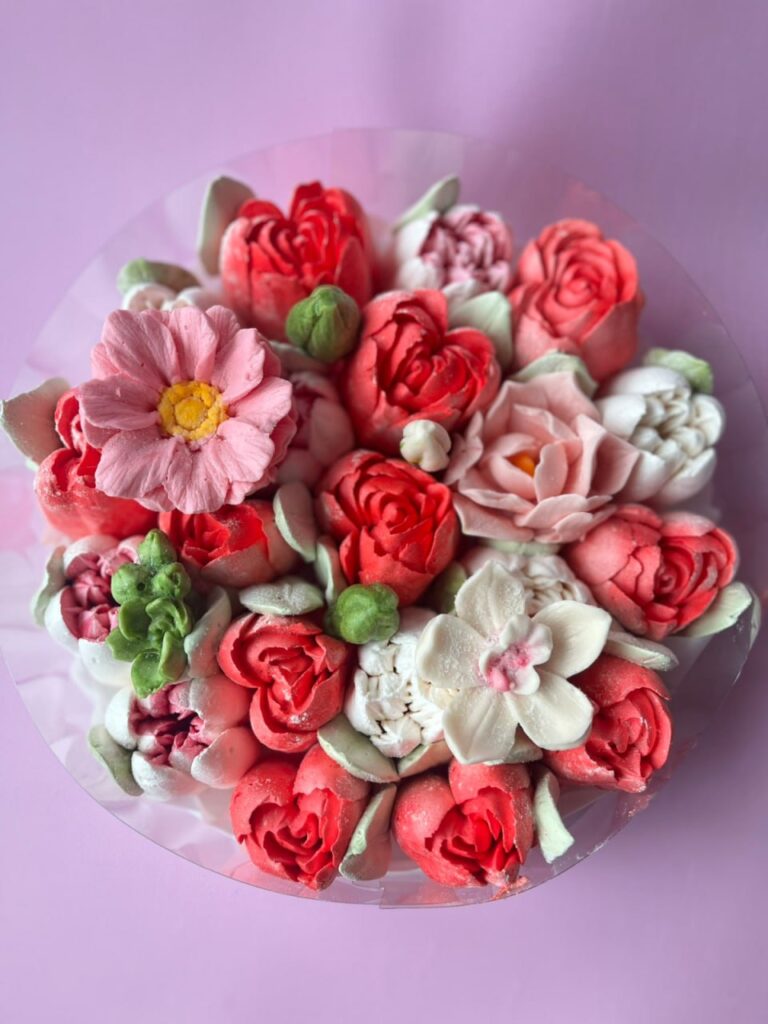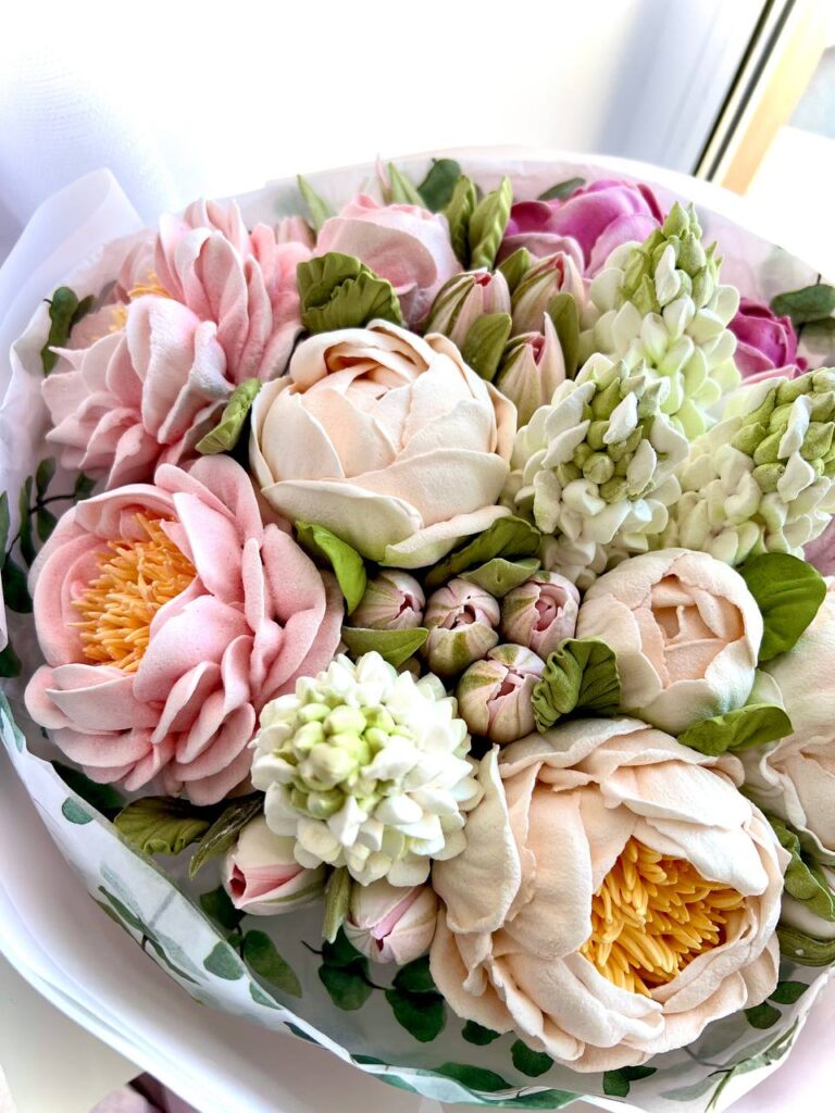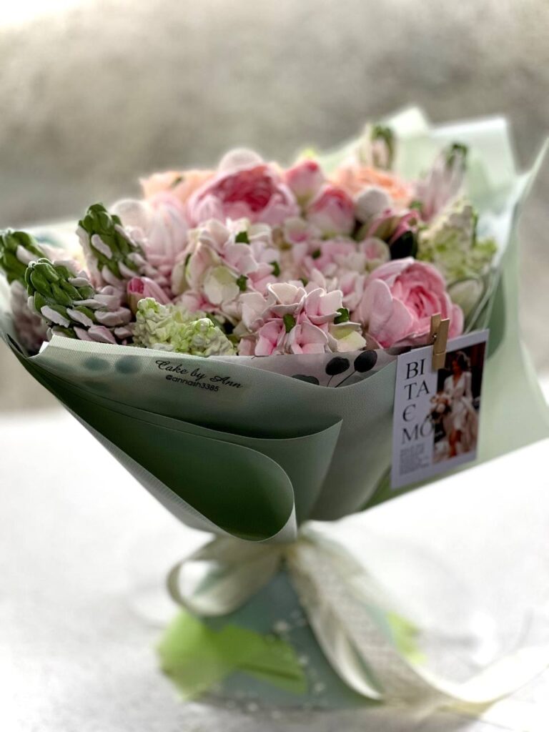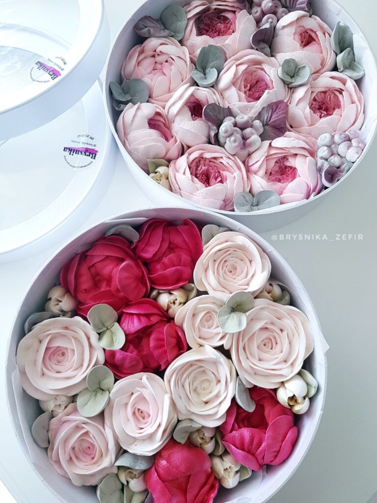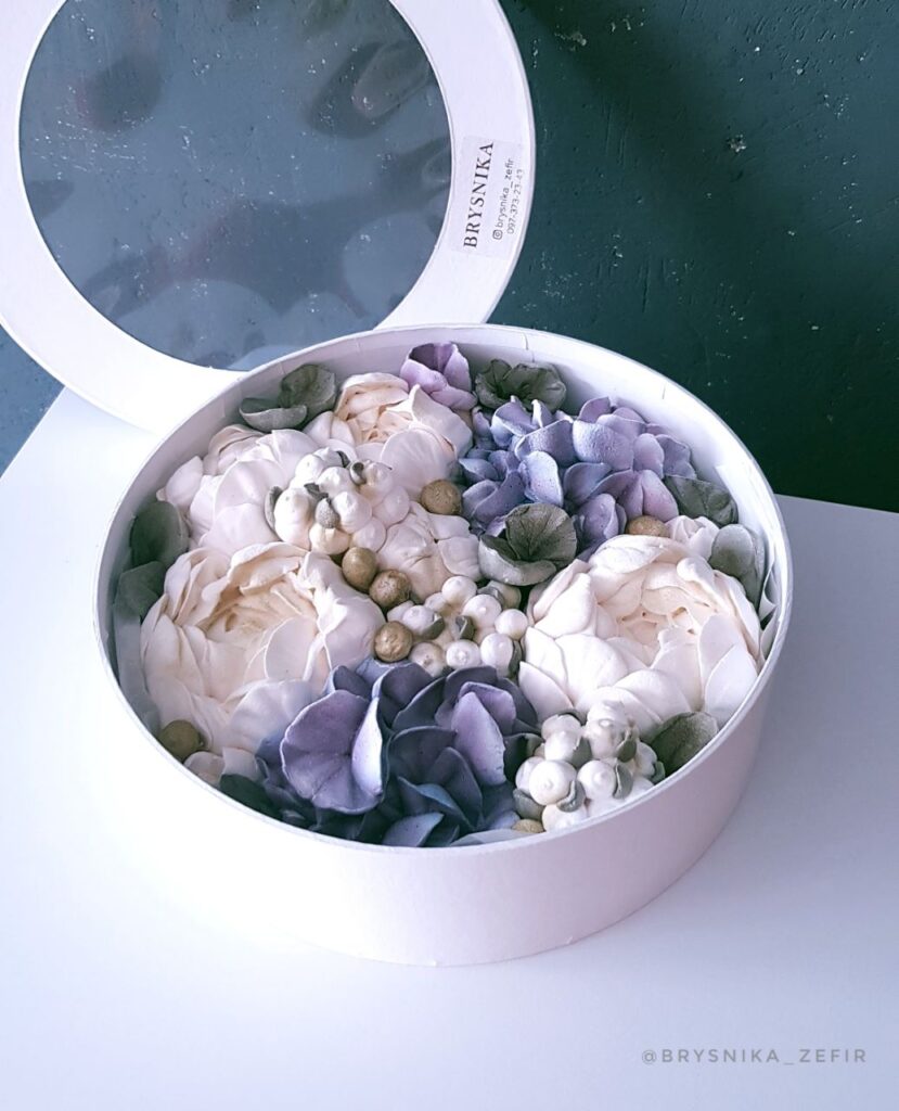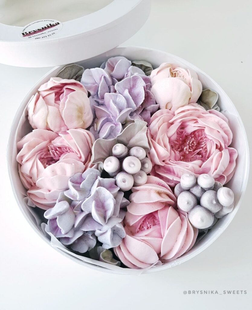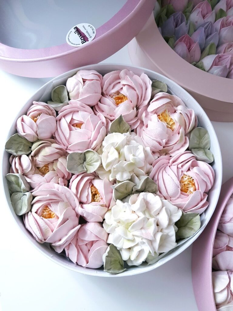 Тюльпани, півонії, гортензія, троянди, ранункулюс, мускарі, бузок і навіть ягоди малини — і все це з зефіру.