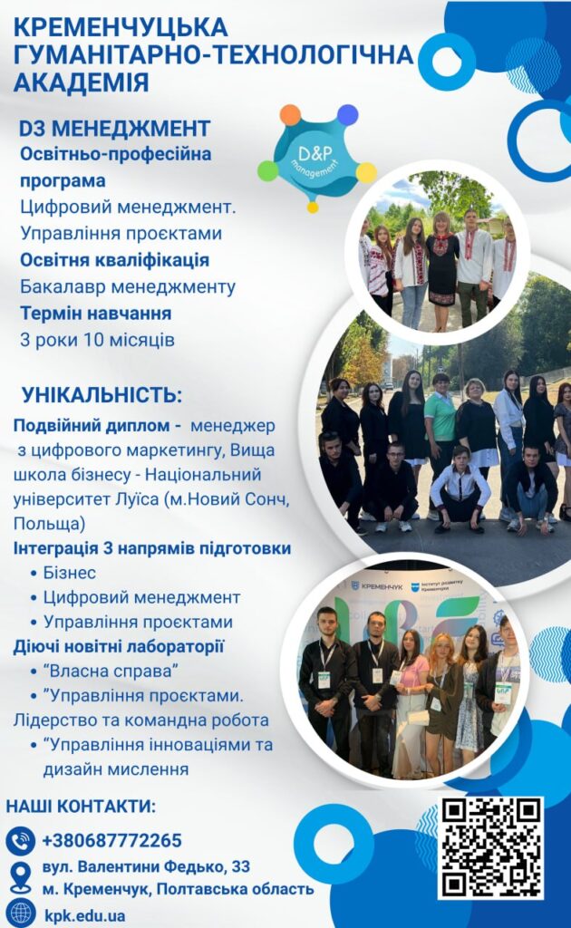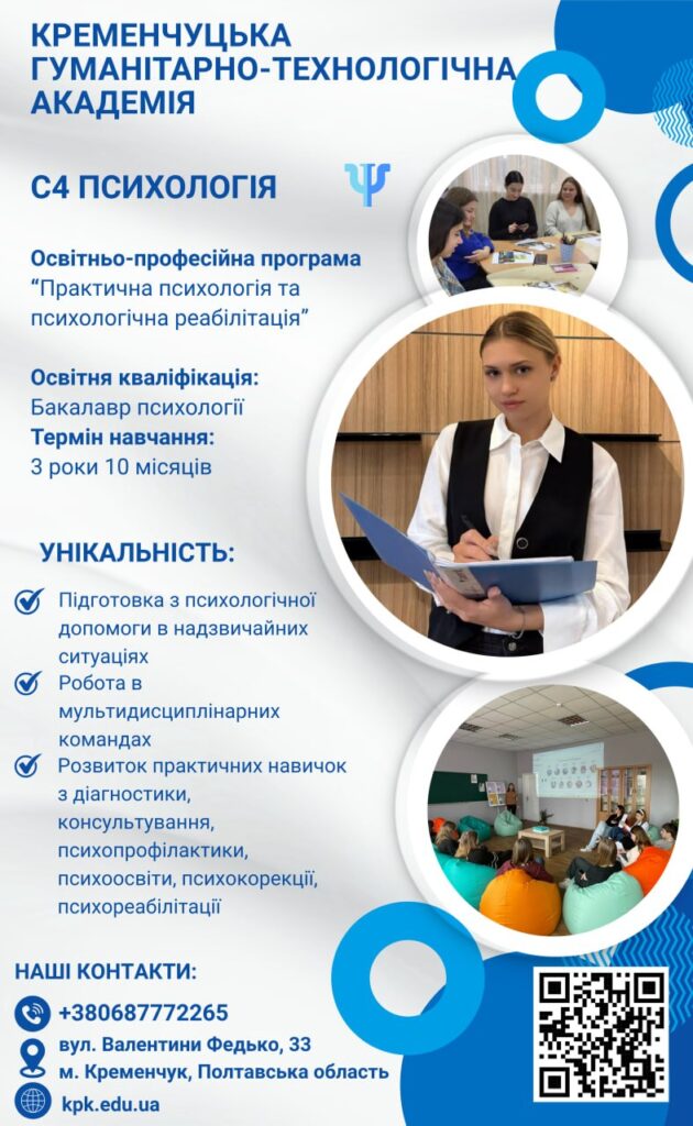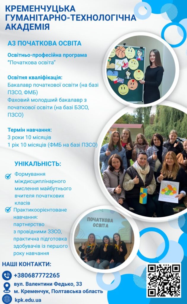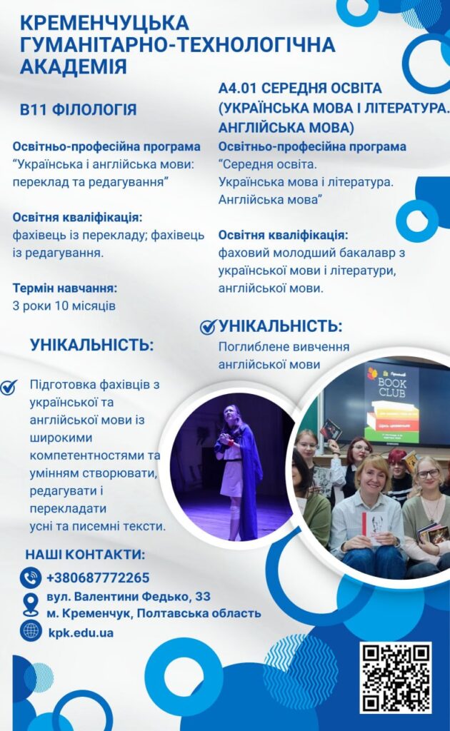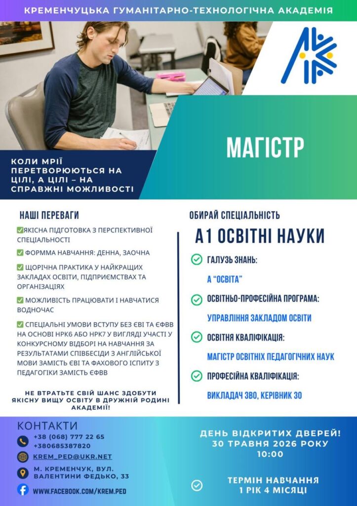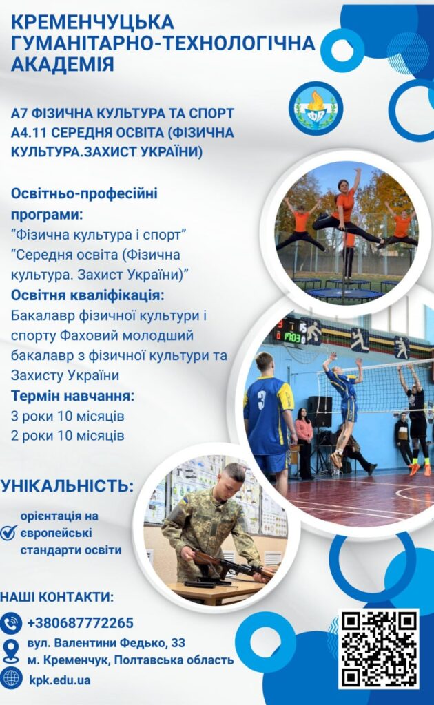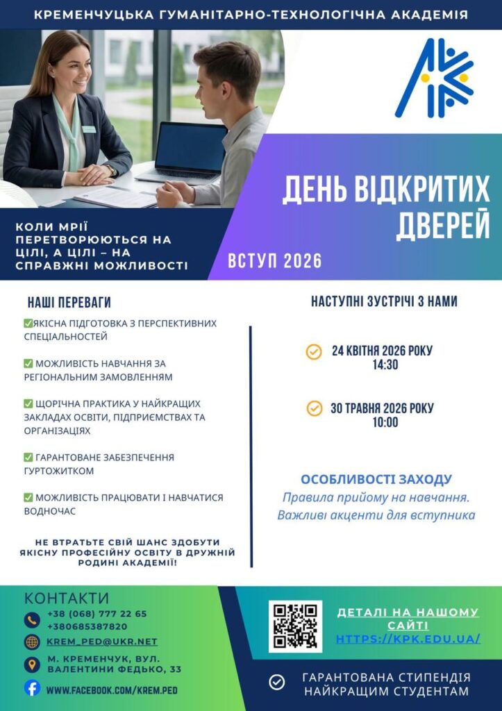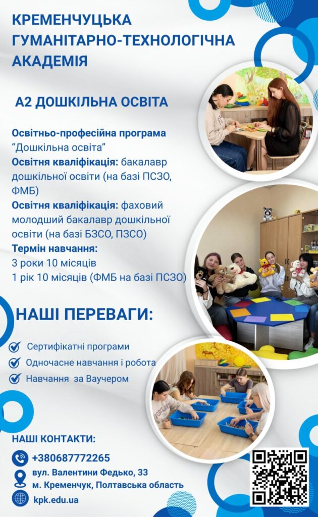 Заклад вищої освіти, у якому інтереси студента на першому місці! Комунальний заклад вищої освіти «Кременчуцька гуманітарно-технологічна академія» Полтавської обласної ради у 2026 році проводить підготовку за трьома рівнями освіти.