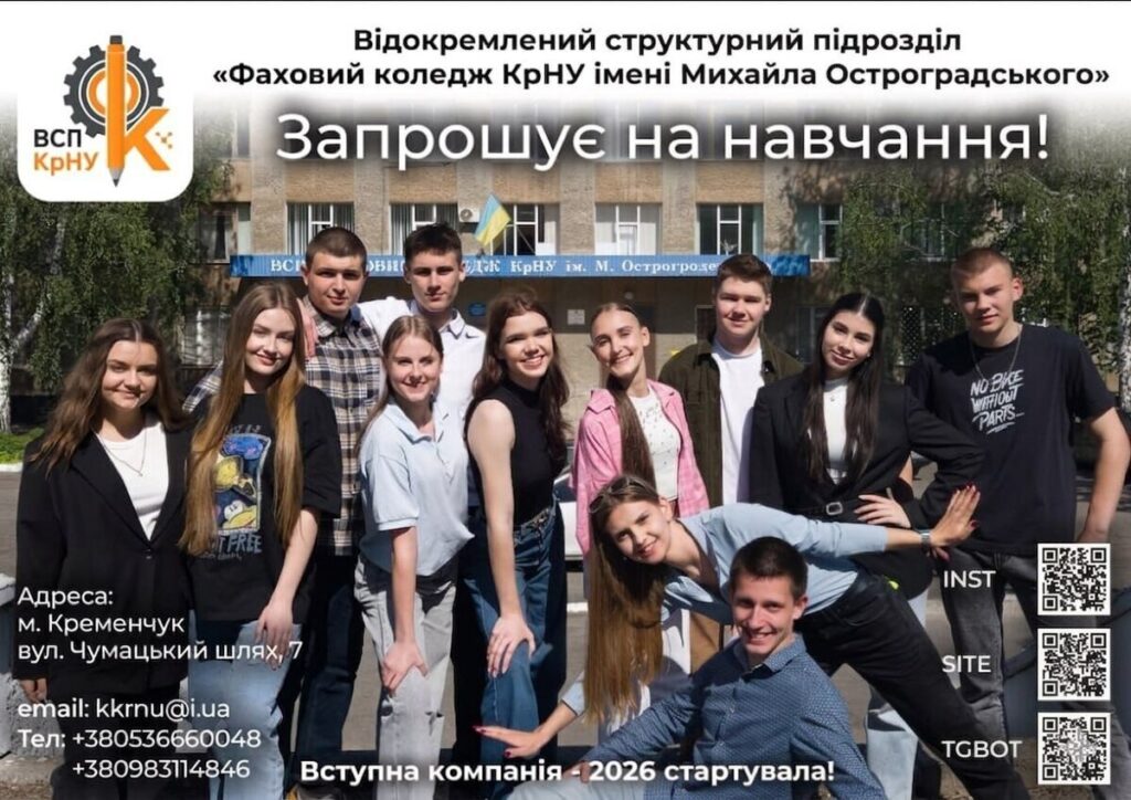 Відокремлений структурний підрозділ «Фаховий коледж Кременчуцького національного університету імені Михайла Остроградського» запрошує абітурієнтів обрати якісну освіту, що відкриває шлях до професійного успіху. Коледж із понад 80-річною історією сьогодні об’єднує більше ніж 1200 студентів та забезпечує підготовку фахівців, затребуваних на сучасному ринку праці.