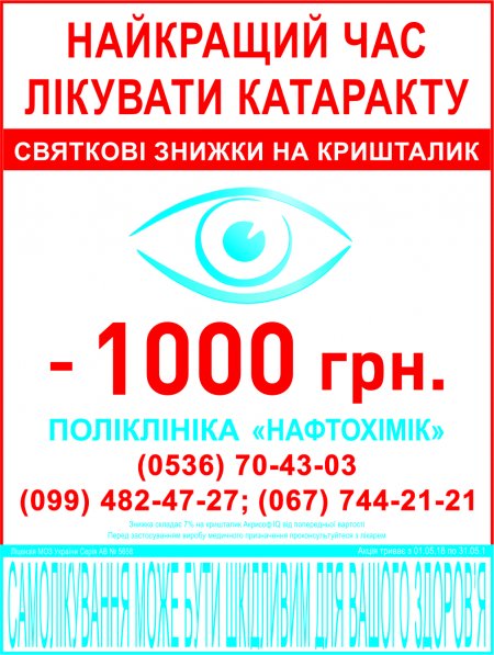 З 01 травня по 31 травня 2018 р. у поліклініці “Нафтохімік” проходить акція “Найкращий час лікувати катаракту та отримувати святкову знижку на кришталик - 1000 гривень.”