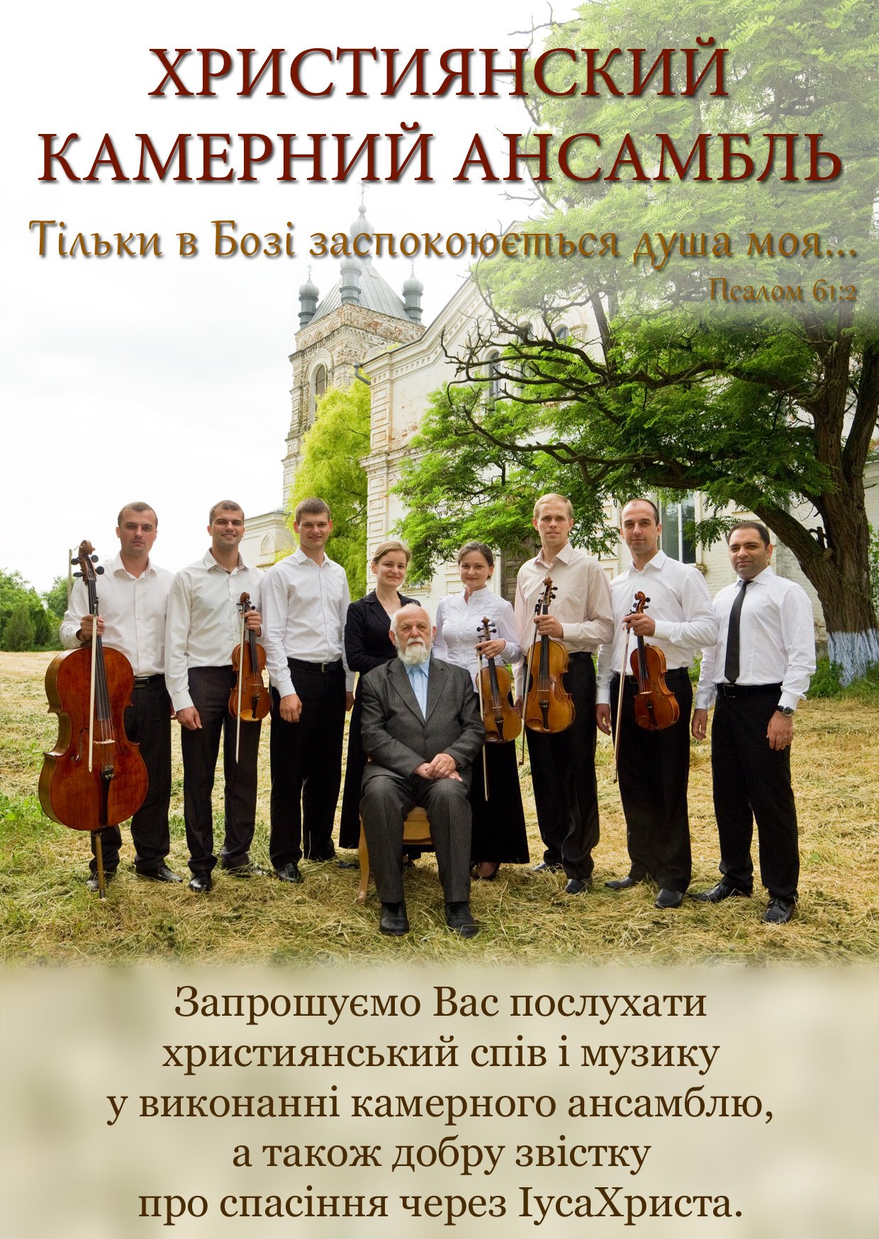 Запрошуєм всіх бажаючих послухати християнський спів і музику у виконанні камерного ансамблю, а також добру звістку про спасіння через Ісуса Христа.