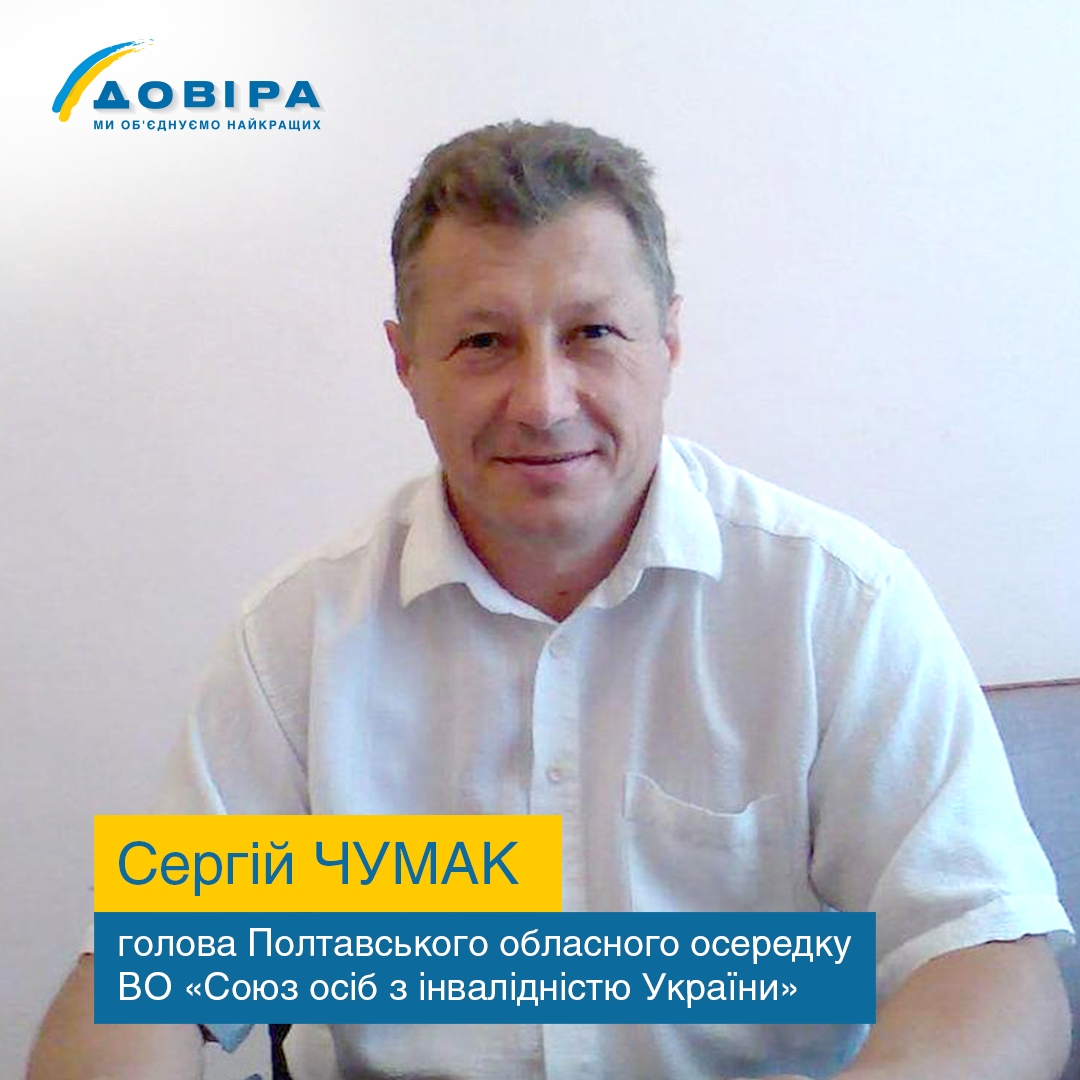 До команди «ДОВІРИ» приєднався Сергій Чумак, який вже багато років опікується проблемами людей з інвалідністю. Сергій Андрійович очолює Полтавський обласний осередок Всеукраїнської організації «Союз осіб з інвалідністю України».