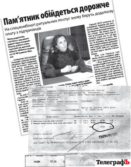 До редакції «Телеграфа» звернувся пенсіонер Володимир Булгаков. Він слідкує за нашими публікаціями щодо різних видів оплат, які то скасовують, то вводять на комбінаті ритуальних послуг. (Див. публікації «Пам’ятник обійдеться дорожче», № 13 від 31.03.11). Йшлося про те, що директор спеціалізованого комбінату ритуальних послуг (СКРП) Юлія Редченко ввела додаткову плату за реєстрацію намогильних споруд, стверджуючи, що ці гроші платитимуть підприємці. А комбінат перевірятиме якість їх послуг, бо підприємці «повинні відповідати за виконану роботу». Натомість Володимир Булгаков надав документи, які свідчать, що платить не підприємець, а людина, яка встановлює пам’ятник. Ось що пише з цього приводу пан Булгаков, цитуємо мовою оригіналу: