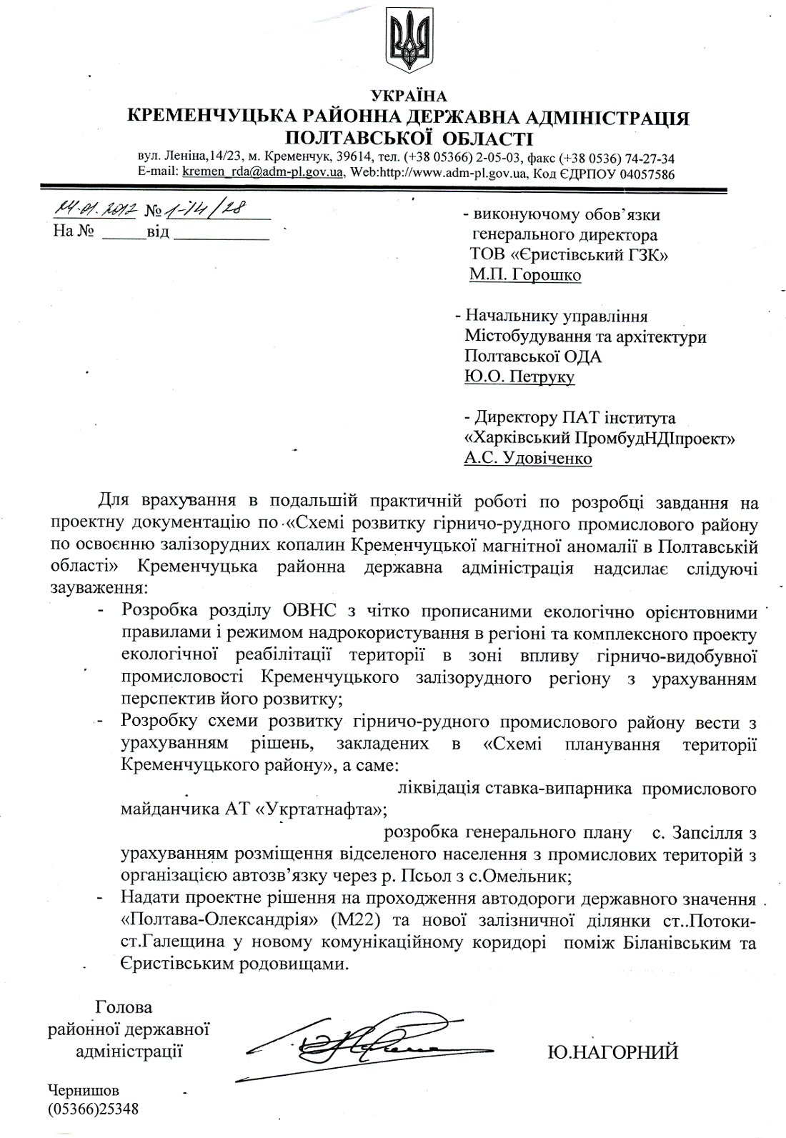 Цей лист з вимогою розробити розділ ОВНС та передбачити ліквідацію ставка-випарника АТ «Уктатнафта» райдержадміністрація направила замовникам будівництва Біланівського ГЗК