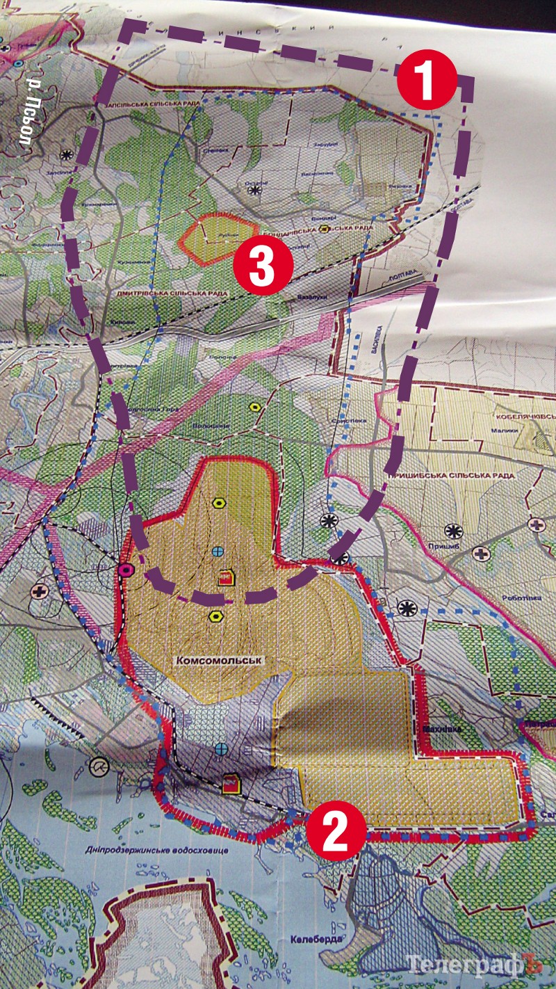 1. Це Схема планування території Кременчуцького району (СПТР), надана відділом містобудування Кременчуцької райдержадміністрації. Рожева пунктирна лінія позначає попередні межі гірничо-рудного промислового району, де буде розташований меткомбінат «Ворскла Сталь» та зконцентровані три ГЗК – Біланівський, Єристівський та Полтавський. Як бачите, в межі району потрапляє і ріка Псьол.