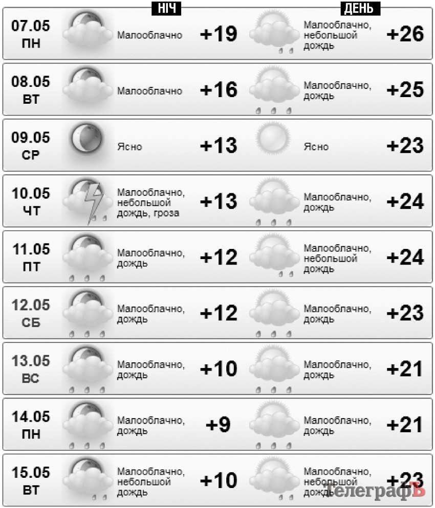 Сезон дощів розпочнеться вже із наступного понеділка. Принаймні так кажуть синоптики. Так, за даними сайту gismeteo.ua, із 7 по 14 травня дощитиме щодня. А 8 травня, напередодні свята, варто чекати справжньої зливи із громом та блискавкою. Якщо плануєте брати участь в урочистостях з нагоди Дня Перемоги, прихопіть із собою парасольку. Проте температура повітря все одно буде доволі високою і коливатиметься від +21 до +24 градусів. Друга половина травня, за прогнозами цього ж сайту, обіцяє бути сонячною і теплою. Так, синоптики прогнозують, що в 20-х числах буде лише чотири дощові дні (20, 21, 26, 28). Найтепліший – 29 травня, температура – до +29 градусів. В інші дні буде приблизно +27.