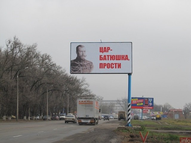 В Полтаве появились билборды с изображением Николая ІІ и надписью «Цар-батюшка, прости». Как сообщает Vpoltave.info, их установили на городском участке трассы Киев-Харьков.