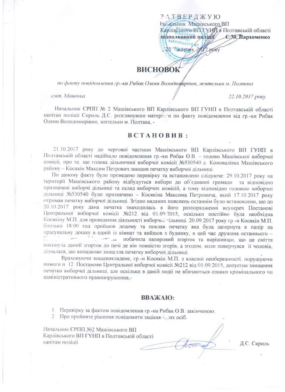 В селе Коноваловка Михайловской объединенной территориальной общины Полтавской области жена председателя участковой избирательной комиссии по неосторожности сожгла в печи печать. 25 октября изготовили дубликат печати.